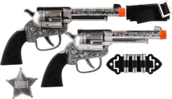 ¡Conviértete en un verdadero vaquero! Este divertido set para pequeños pistoleros incluye 2 pistolas de plástico de 19 cm, fundas para el cinturón y placa de sheriff, además de otros accesorios para un juego auténtico. Ideal para carnaval, disfraces y aventuras en casa. Diseño seguro con punteras naranjas y apto para niños a partir de 3 años.