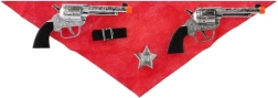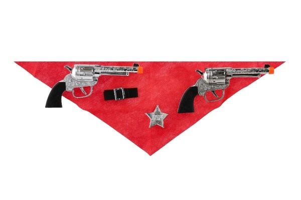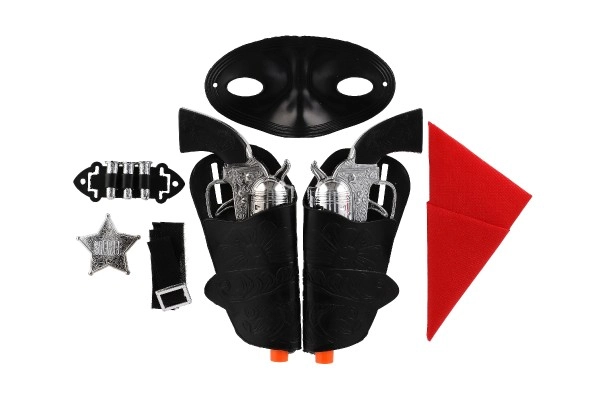 Dos pistolas con fundas, placa de sheriff, máscara, pañuelo rojo y cinturón con hebilla: todo para un disfraz vaquero perfecto y un juego realista.