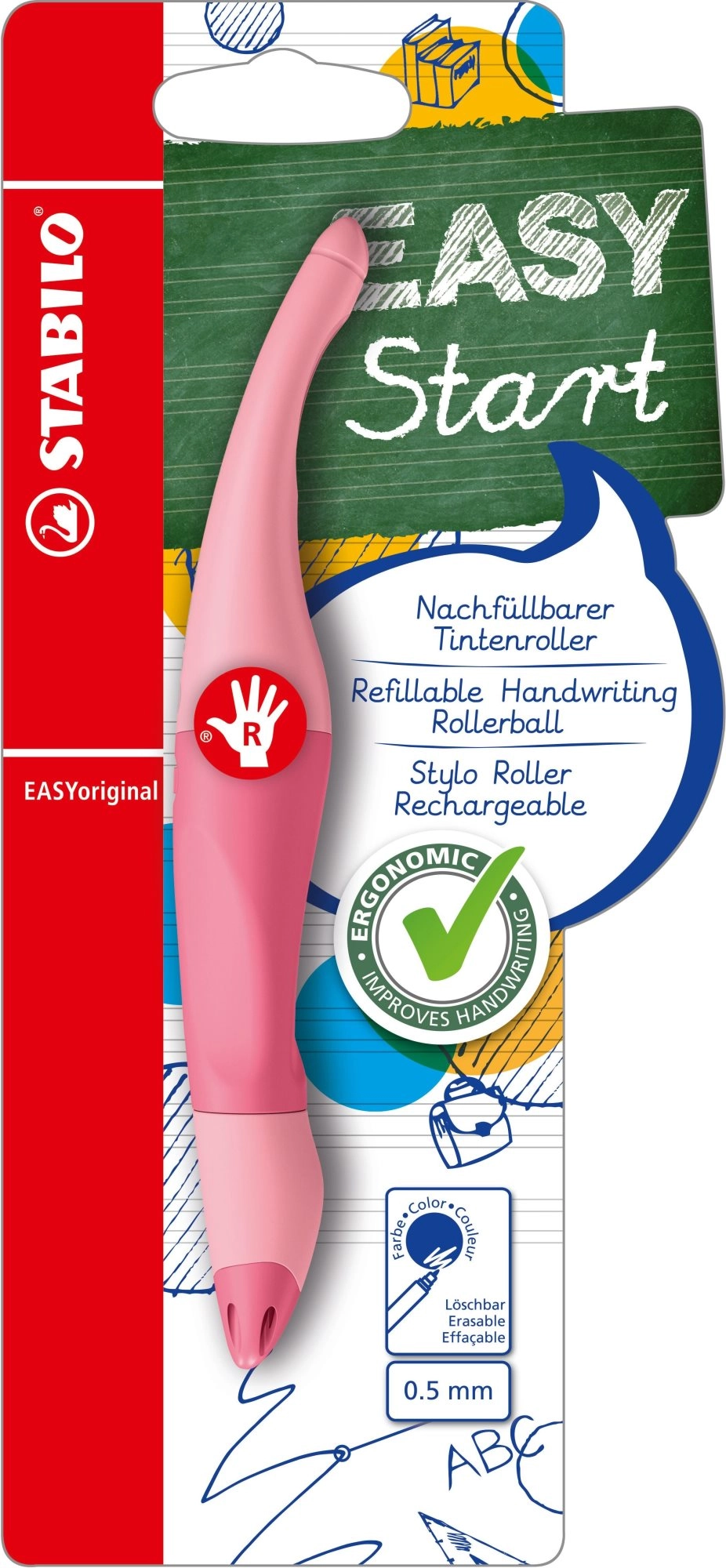 STABILO EASYoriginal es un bolígrafo escolar popular diseñado especialmente para diestros. Su cuerpo de forma ergonómica y las zonas de agarre antideslizantes ayudan a los niños a adquirir un agarre correcto y una escritura cómoda. El roller ofrece un trazo limpio y uniforme sin rascar y sin manchas.