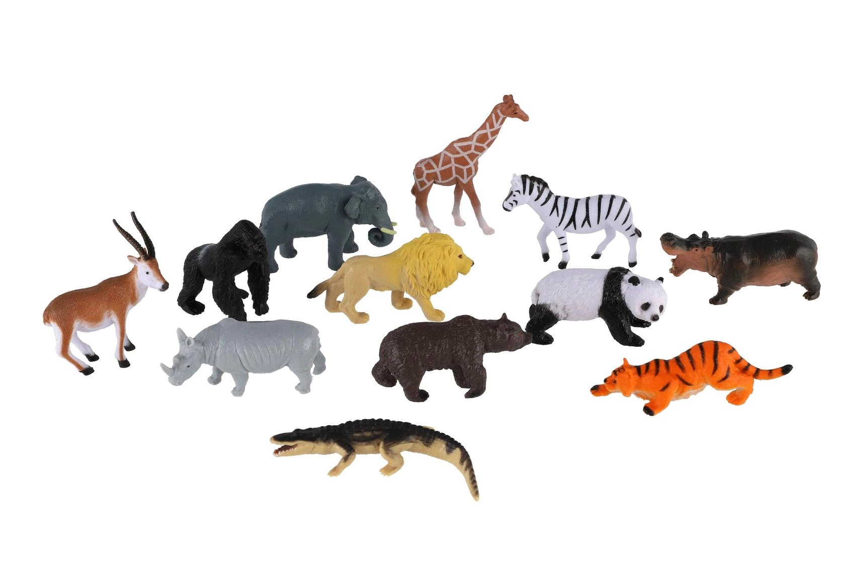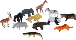 El set incluye animales de safari populares —león, cebra, jirafa, elefante, rinoceronte, hipopótamo, tigre, cocodrilo, panda y más— para juegos y escenas variados.