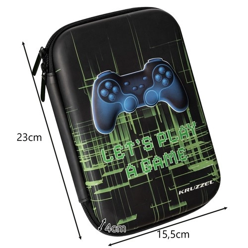 La parte frontal luce un gamepad en 3D con el texto «LET’S PLAY A GAME», que aporta un marcado carácter gaming al estuche. Una gran elección para niños y adolescentes.