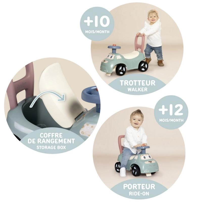 El correpasillos con forma de coche combina seguridad y comodidad. Gracias a su estructura estable y diseño ergonómico, es ideal para los más pequeños. Sus características destacadas incluyen: