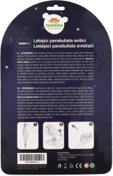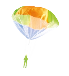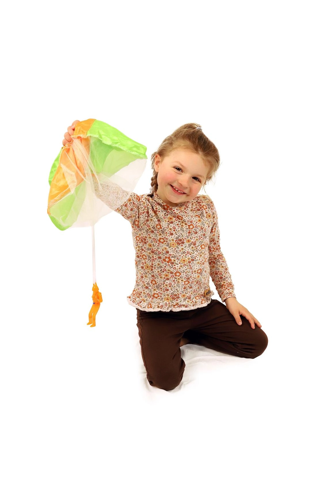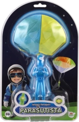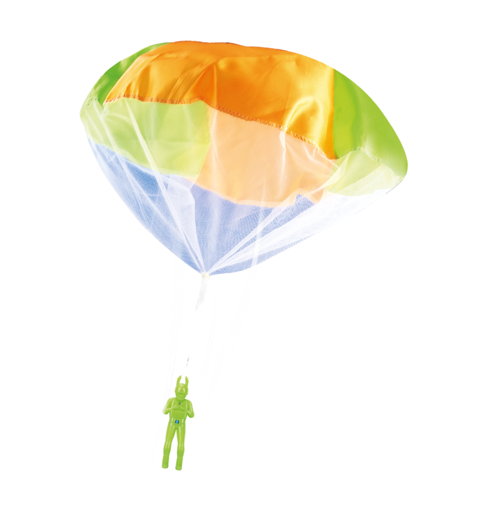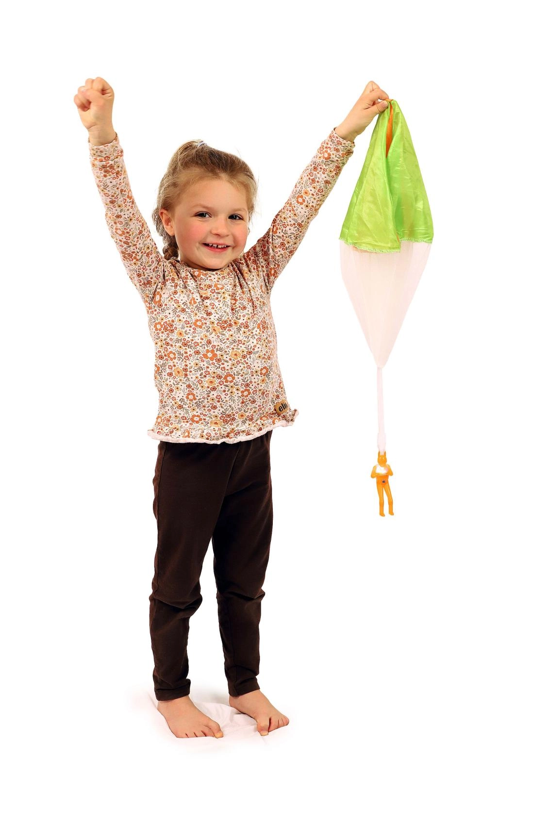 El paracaídas de tela ligera se despliega en el aire y estabiliza la caída de la figura: planeo seguro y vistoso para niños a partir de 3 años.