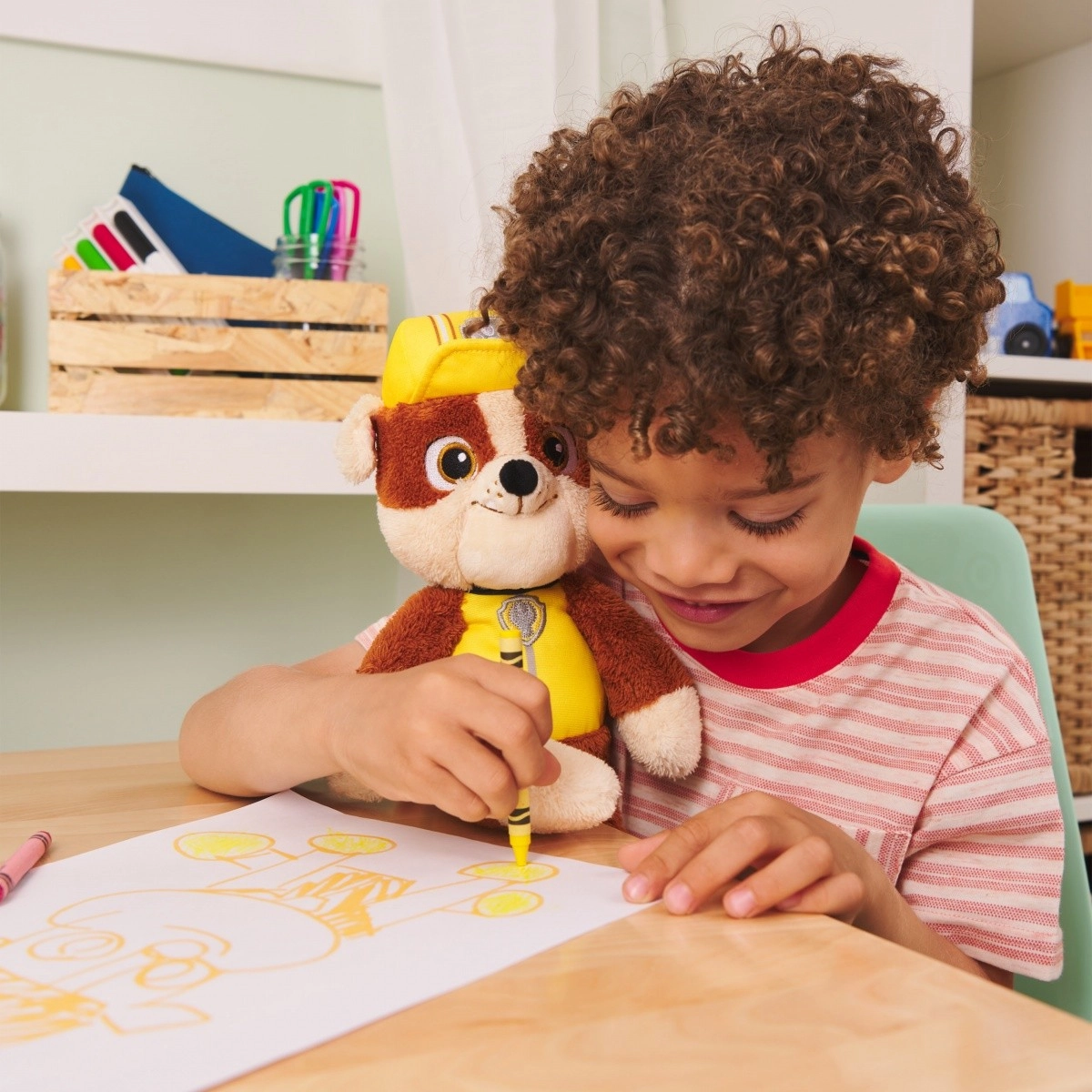 Este Rubble de 33 cm lleva uniforme y casco de construcción en color amarillo, con la insignia característica de la Patrulla Canina y pelaje de peluche marrón; ideal para jugar durante los viajes.