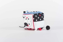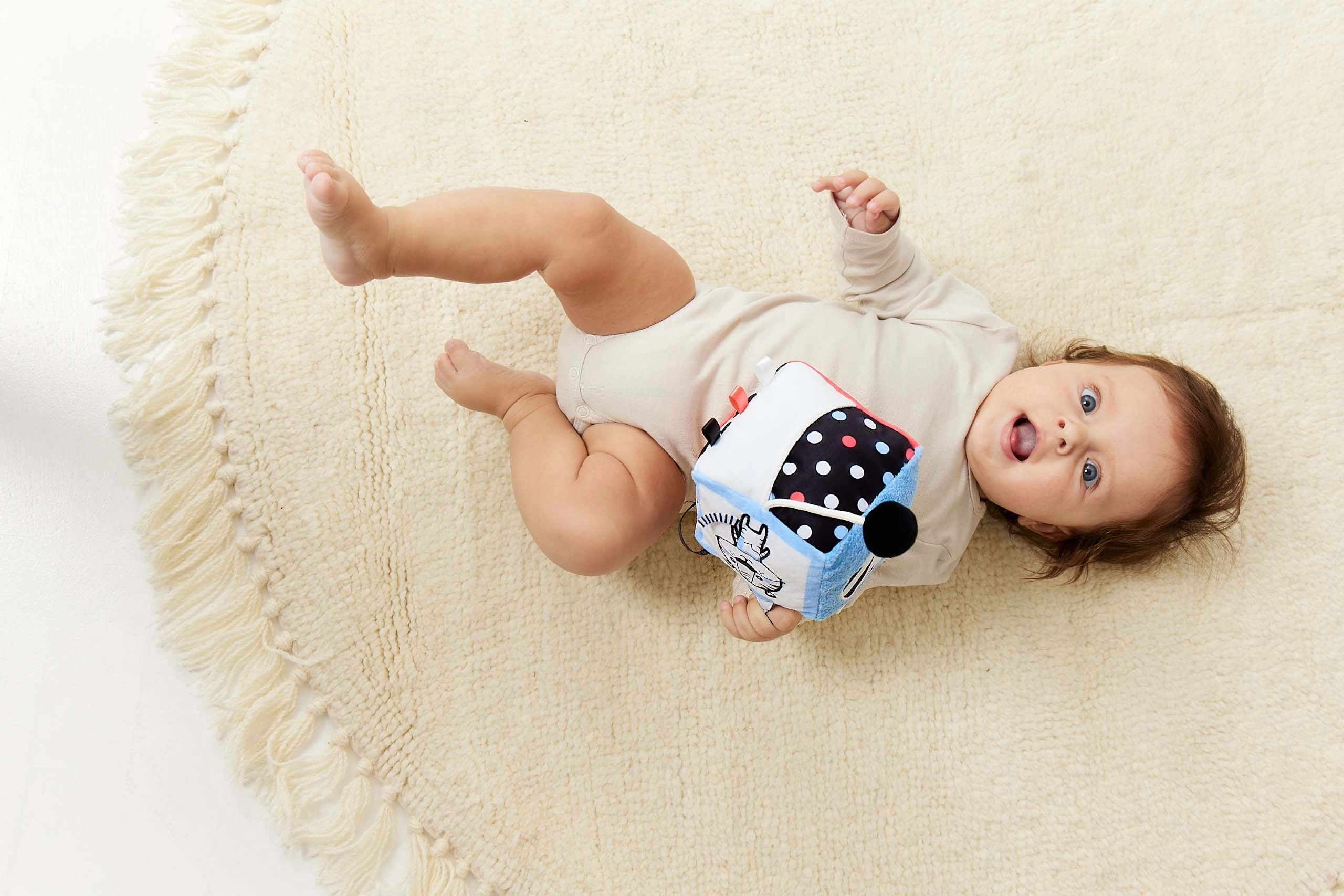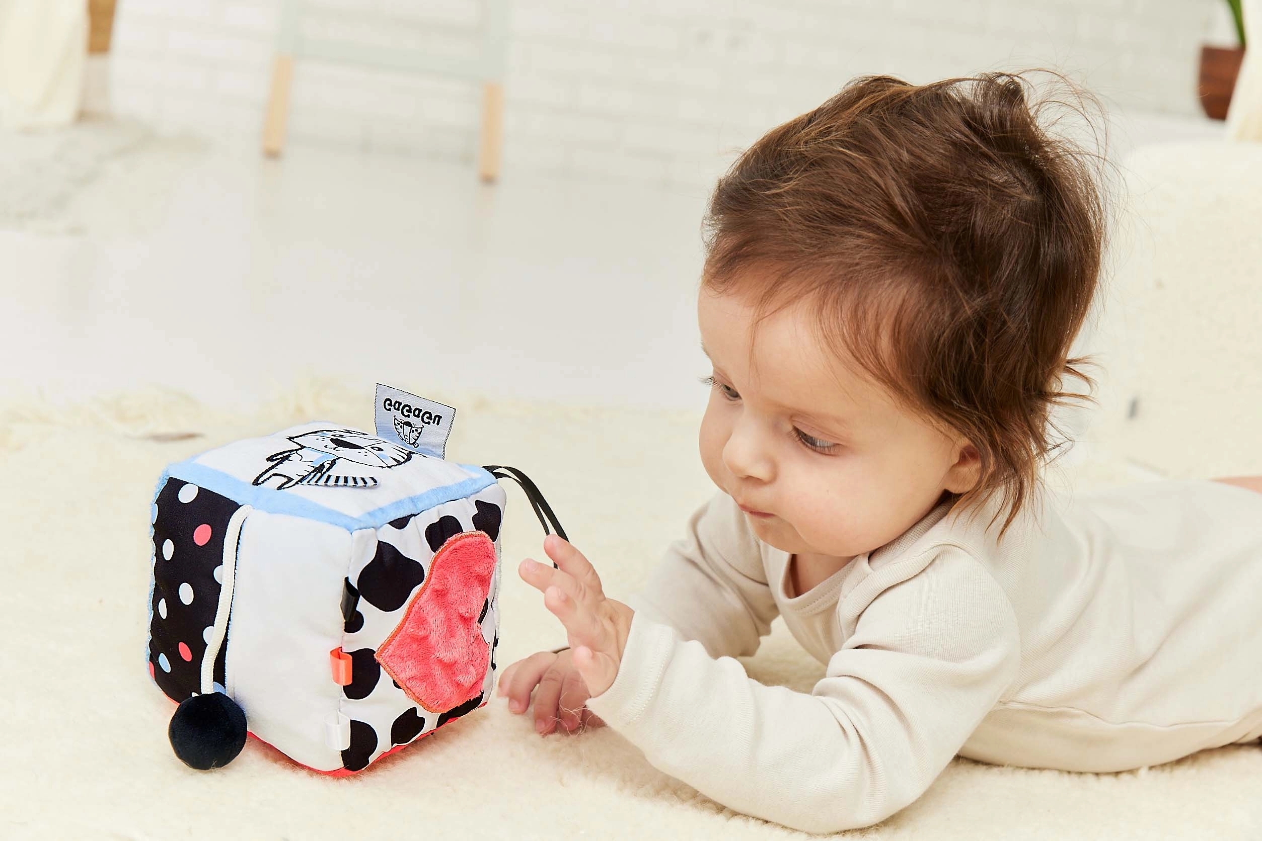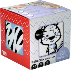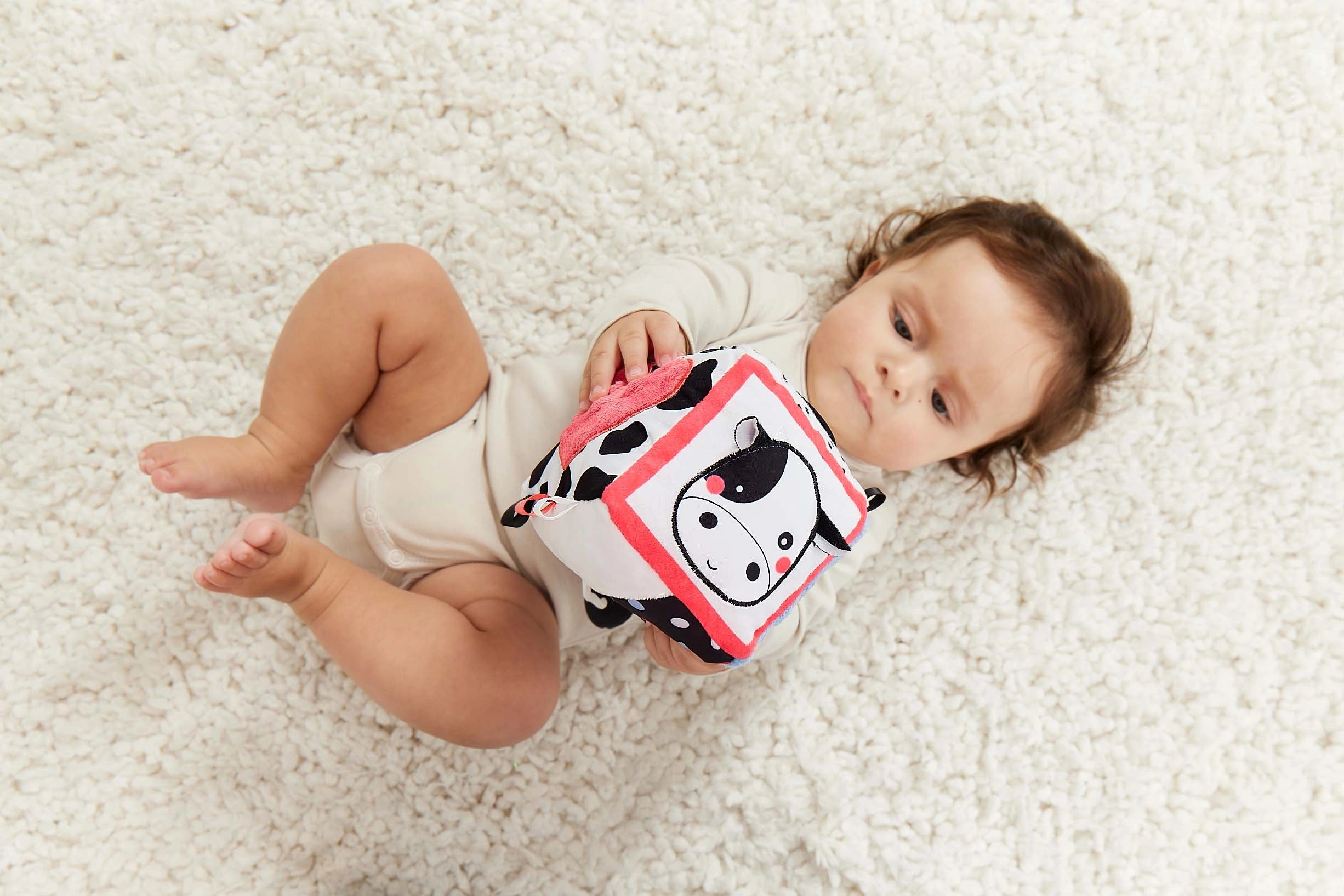 Este suave cubo sensorial está diseñado para los exploradores más pequeños. Cada una de sus seis caras ofrece una experiencia sensorial distinta: desde patrones en blanco y negro de alto contraste con acentos de color hasta tejidos y superficies variadas que invitan al tacto y al descubrimiento. Los adorables motivos de vaca y tigre despiertan la curiosidad y enseñan al niño a percibir formas y emociones.