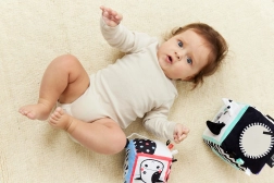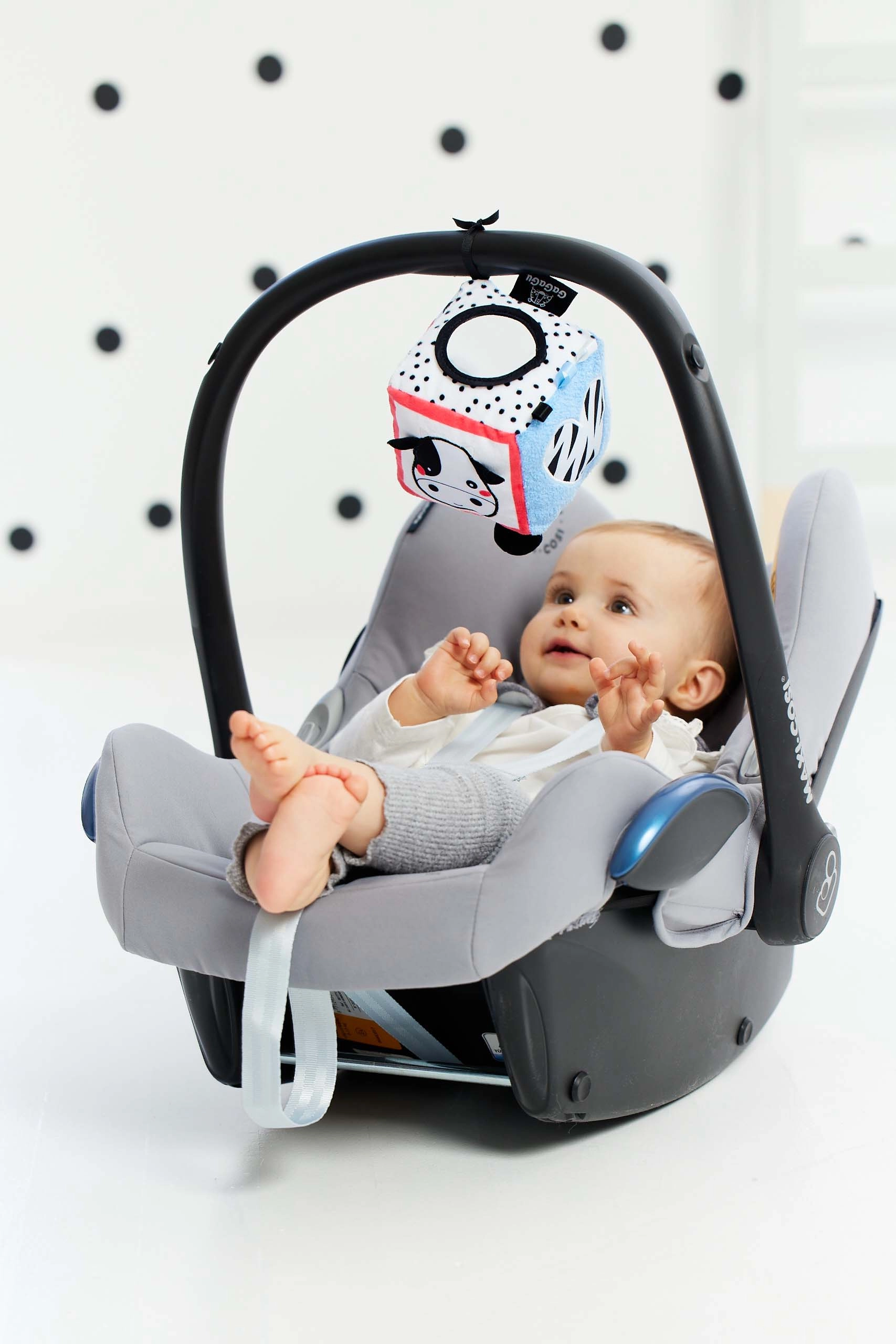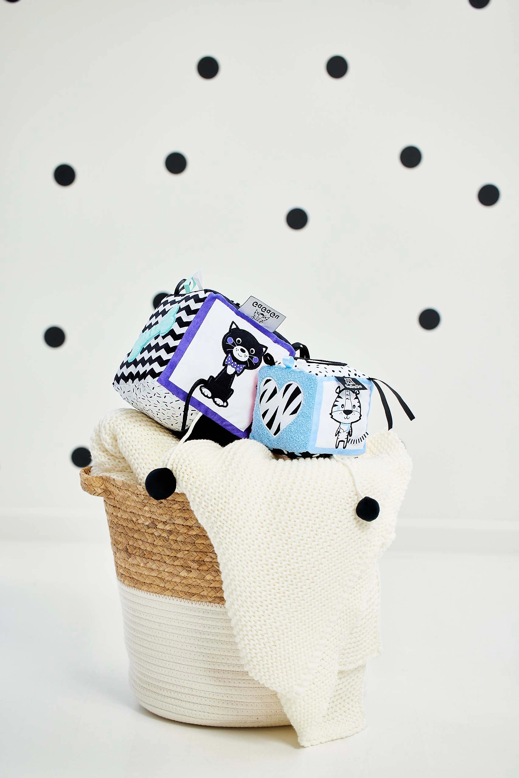 El alto contraste de los motivos en blanco y negro con detalles de color estimula la vista y mantiene la atención del bebé durante el juego.