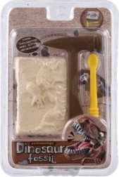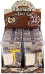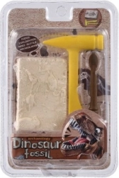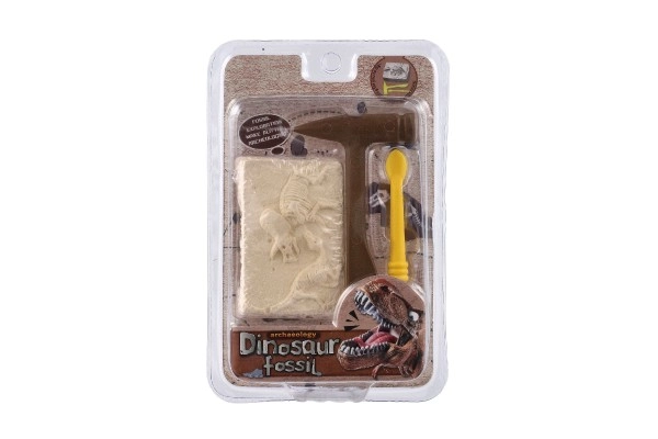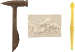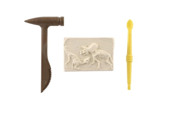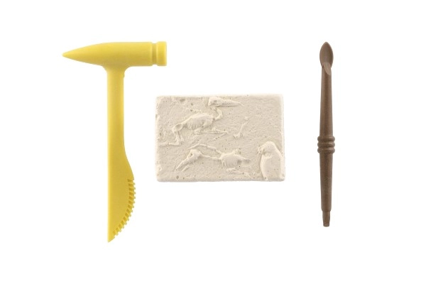 El paquete contiene un bloque con la impresión de un esqueleto de dinosaurio y las herramientas necesarias para excavar: un martillo y un cincel de plástico.