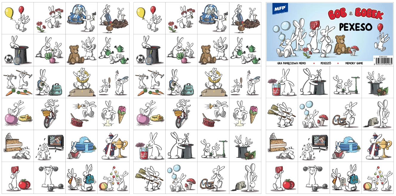 Descubre la magia del juego clásico con el pexeso Bob y Bobek. El set en formato 3×A4 ofrece pares coloridos de imágenes con los héroes de los populares cuentos de la Televisión Checa. Ideal para tardes en familia, educación infantil y primaria.