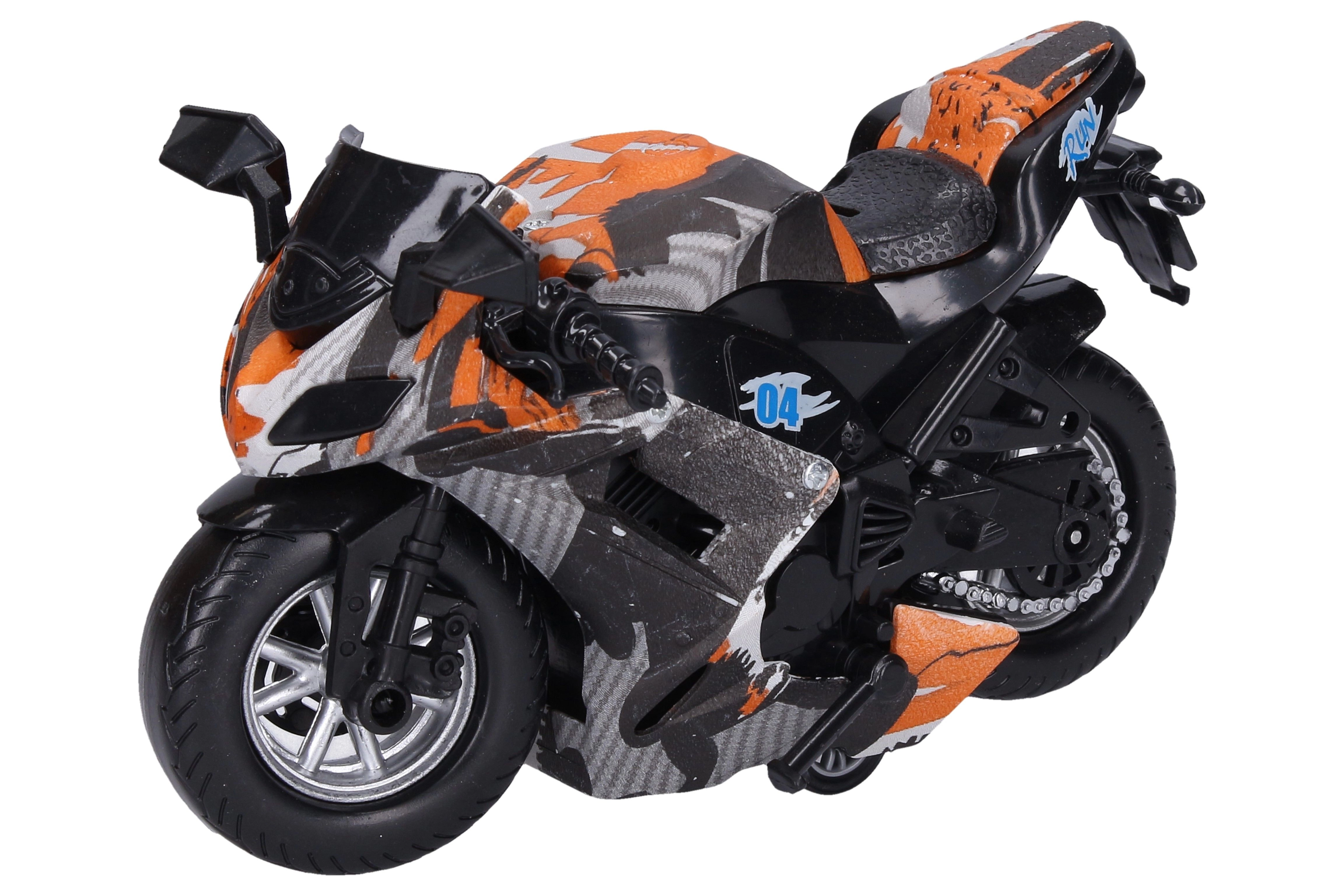 Esta estilosa moto de retroceso ofrece diversión a toda velocidad sin necesidad de pilas. Un simple tirón hacia atrás y un arranque suave hacia adelante la convierten en el juguete perfecto para niños que adoran las carreras y el juego dinámico. Su tamaño compacto de 16 cm cabe en la mochila o en el bolsillo del cochecito.