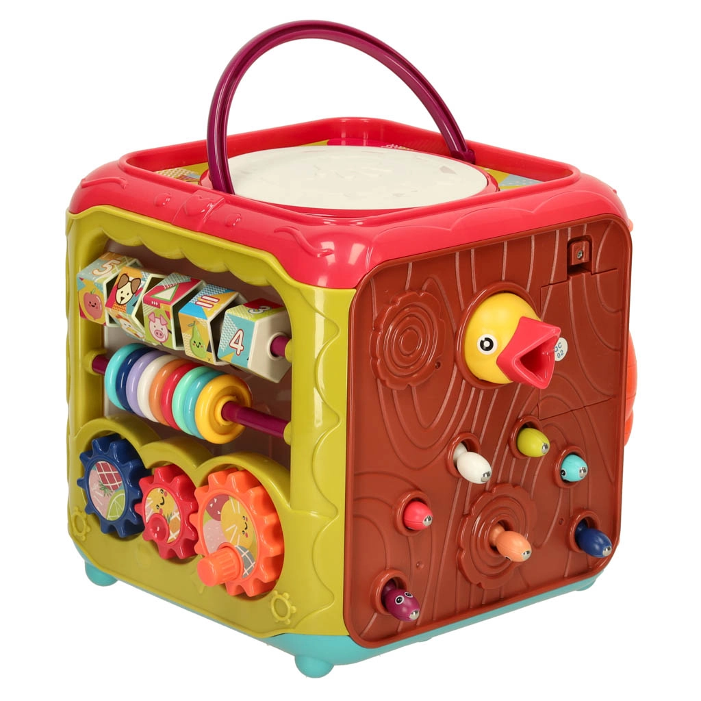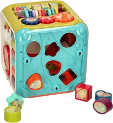 El clasificador de formas, las ruedecillas y los elementos deslizantes entrenan el agarre, la coordinación y la resolución de tareas. Los cubos y números de colores fomentan el reconocimiento de colores, formas y el conteo.