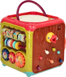 Cada cara ofrece una actividad diferente: pianito con sonidos de animales, puertecitas con animalitos, engranajes, trenecito, ábaco y más. El niño aprende de forma natural jugando.