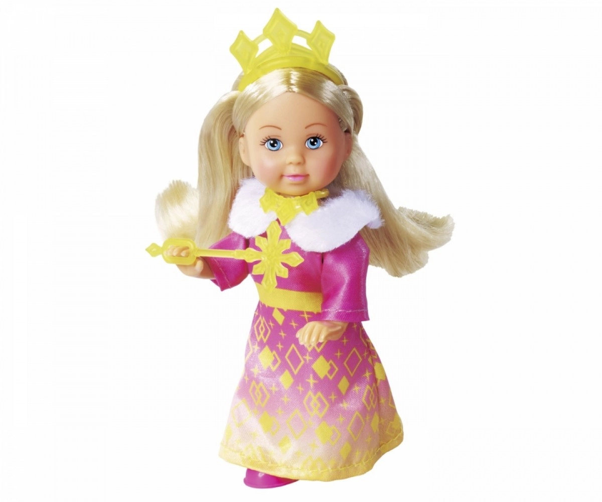 La muñeca lleva un vestido elegante, una corona dorada y un cetro mágico. Los accesorios aportan un toque real al juego.