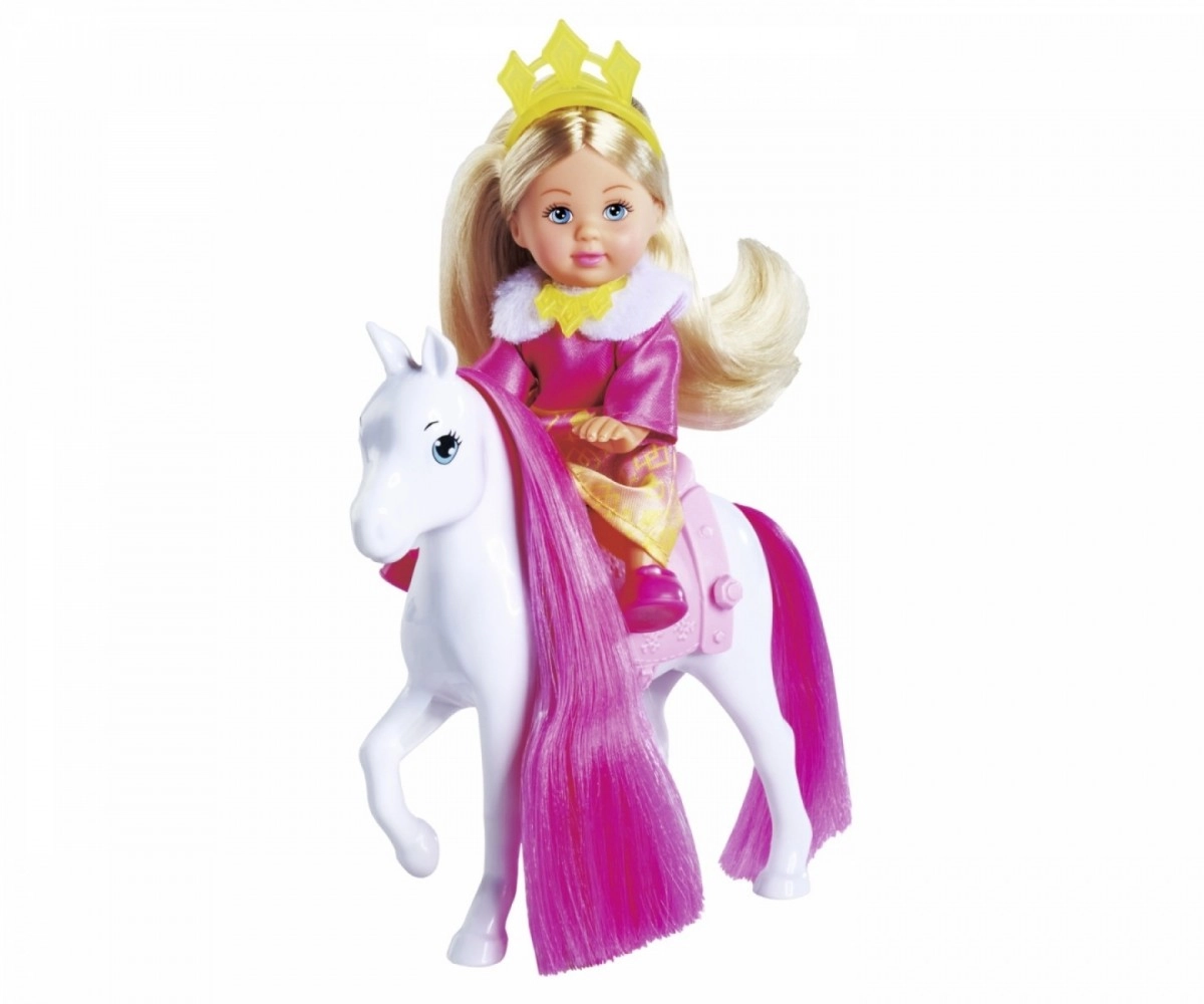 El paquete incluye accesorios de princesa como corona, collar y cetro, así como un caballito con silla para que Evi también pueda montar por separado. La larga crin y la cola del caballito invitan a peinar y estilizar, ayudando a los niños a desarrollar la motricidad fina y el sentido del cuidado.