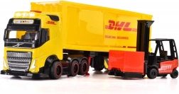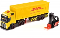 Descubre el camión VOLVO con remolque de DICKIE TOYS con licencia DHL de 35 cm de longitud. Incluye una carretilla elevadora roja y cajas de carga para un juego logístico auténtico. El vehículo ofrece efectos de luz y sonido, partes abatibles y móviles y una construcción resistente para jugar en casa, al aire libre e incluso en la arena.