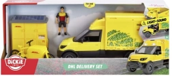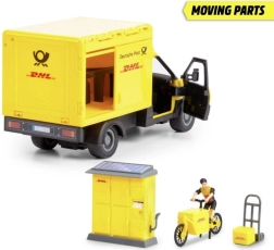 Descubre el realista set de mensajería con licencia de DHL y vehículo VOLVO de Dickie Toys. El set ofrece efectos de luz y sonido, puertas abatibles, una figura de mensajero, paczkomat/box de paquetería, bicicleta y accesorios para un juego imaginativo. Ideal para desarrollar la creatividad, la motricidad fina y el pensamiento lógico de los niños.