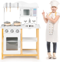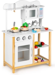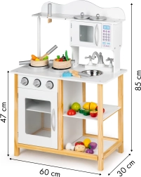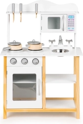 La cocinita de madera Ecotoys está diseñada para niños a partir de 3 años. Su alta calidad de fabricación y gran estabilidad proporcionan un juego seguro y divertido. Los electrodomésticos como el horno y el microondas tienen puertas abatibles, mientras que las perillas giratorias emiten sonidos de clic realistas.