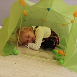 Construye tu propia base secreta, cúpula, túnel o tienda: la imaginación no tiene límites. Las varillas de plástico resistentes y los conectores esféricos firmes permiten crear estructuras estables que pueden cubrirse con la lona verde incluida. Gracias a las pajitas fluorescentes, las creaciones resultan atractivas incluso con poca luz.