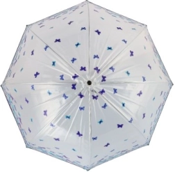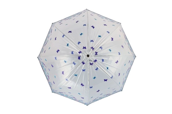 Este paraguas destaca por su atractivo diseño de mariposas azules y moradas, que aportará un estilo único a tu atuendo.
