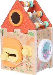 Este juguete es ideal para el desarrollo infantil, ya que cada lado de la casita esconde una nueva aventura, ya sea encajar, deslizar o cerraduras. El cubo también incluye un ábaco que sirve como techo de la casita.