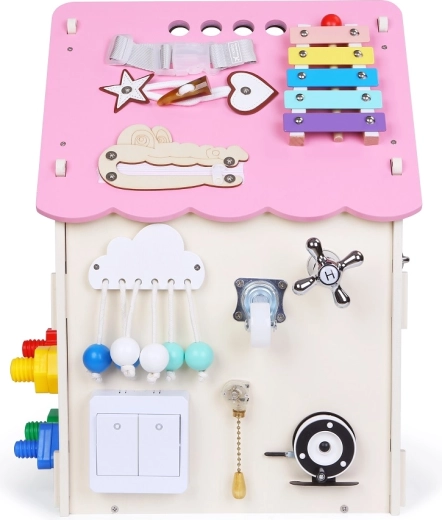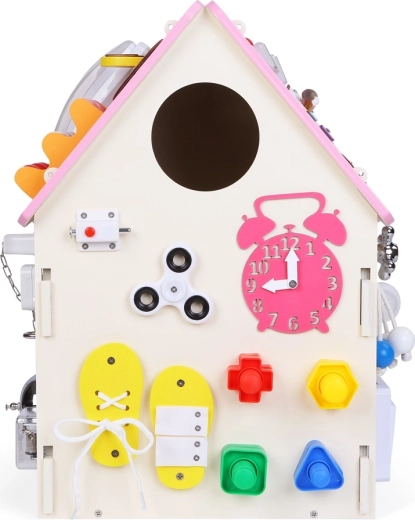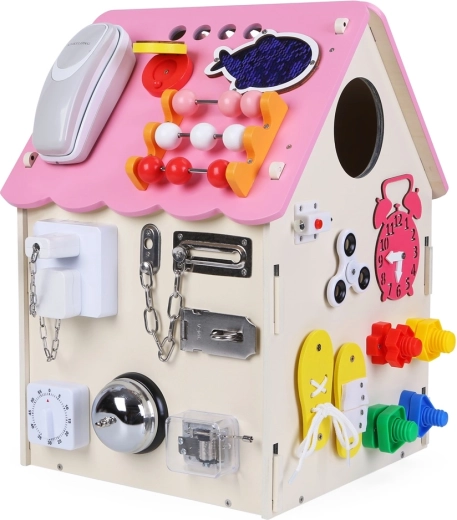 Casita interactiva de madera con numerosos elementos para la exploración sensorial y el aprendizaje que desarrollan la motricidad fina, la coordinación mano-ojo y la autonomía. Los niños practican de forma divertida abrochar, atar, cambiar interruptores, girar y abrir cerraduras, y al mismo tiempo se familiarizan con el ábaco y el reloj.