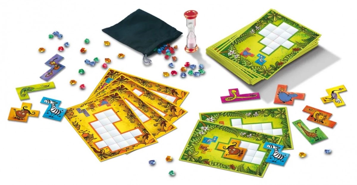 Ubongo Junior es una versión ágil para niños del legendario UBONGO ambientada en la selva africana. Los jugadores colocan rápidamente las piezas con animales para llenar exactamente el tablero sin dejar espacios en blanco; quien lo logre primero grita “¡Ubongo!” y roba gemas. Gracias a dos niveles de dificultad, el juego se adapta fácilmente a la edad y experiencia de los niños y sigue siendo divertido en partidas repetidas.