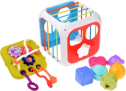 El paquete incluye el cubo, 6 bloques sonajeros de colores y un panel sensorial de doble cara. Todo en colores y formas agradables que invitan a explorar.