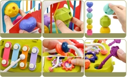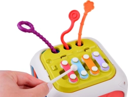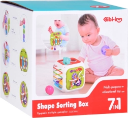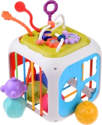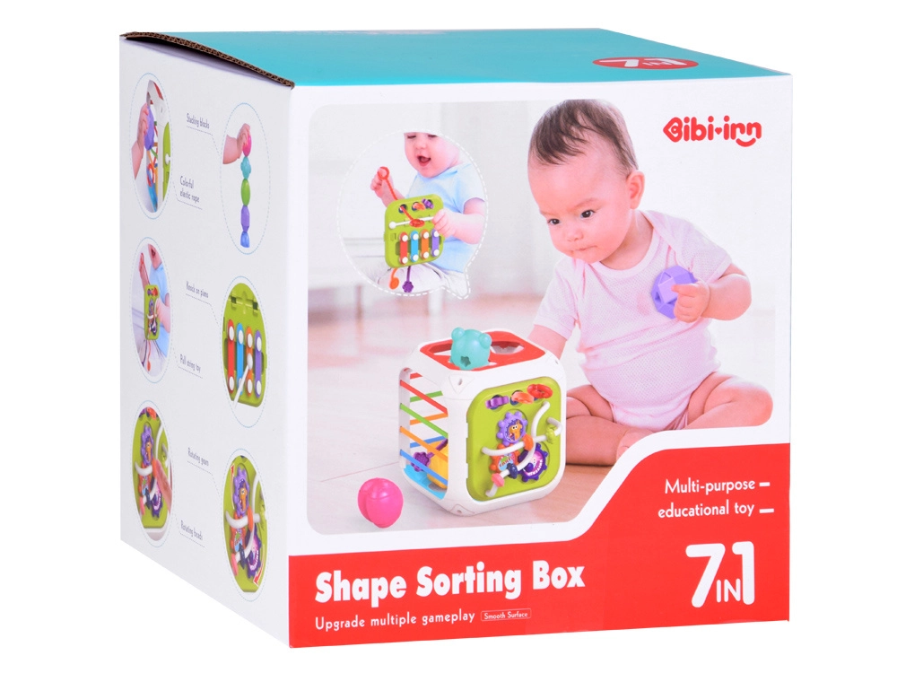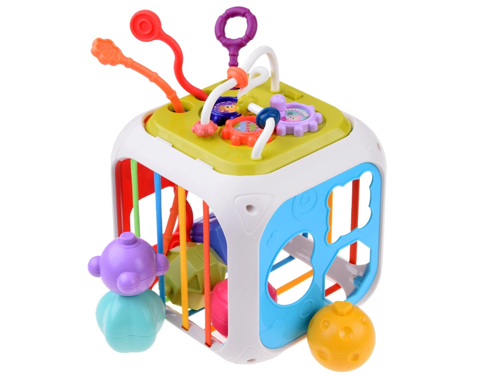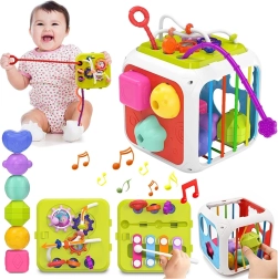 Este colorido cubo educativo de plástico de calidad combina las actividades favoritas de los más pequeños en un formato compacto. Dos caras funcionan como clasificador de formas con diferentes aberturas; otras tres incorporan gomas elásticas para empujar los bloques y entrenar el tacto. El panel de doble cara añade metalófono y cordones de diferentes texturas en un lado, y engranajes y cuentas deslizantes en el otro.