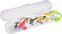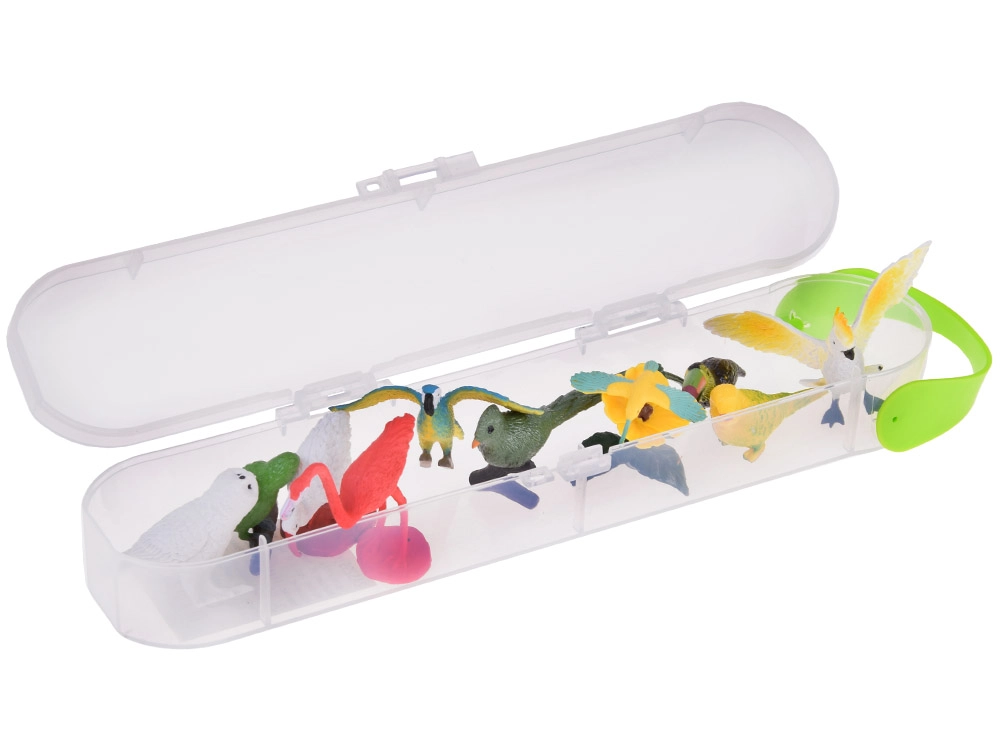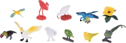 El paquete incluye 10 especies distintas de aves y 1 flor para completar la escena. Gracias a sus dimensiones compactas, las figuras se transportan fácilmente y se adaptan perfectamente a la mano de un niño.