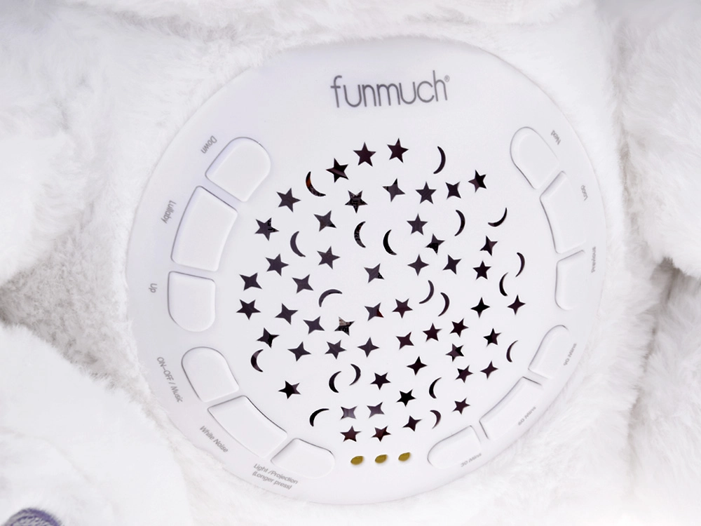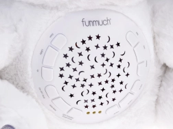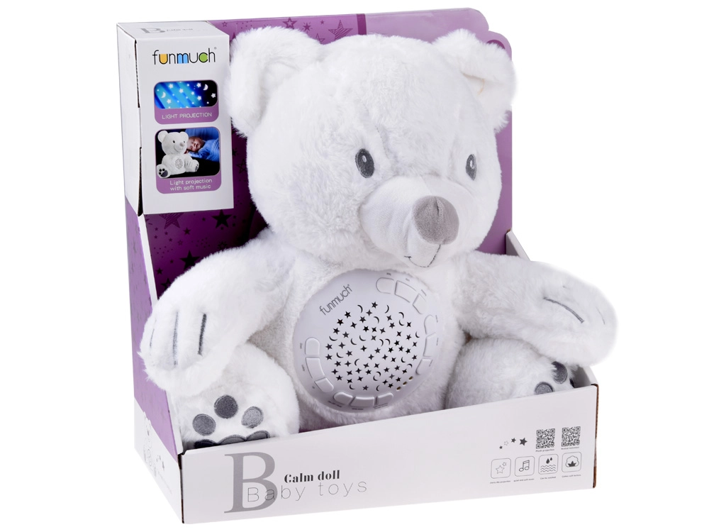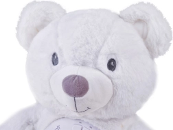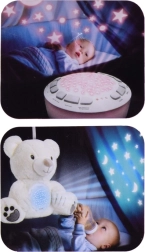 Este suave osito blanco combina juguete y luz nocturna en uno. Gracias a 6 suaves nanas y 5 sonidos auténticos de la naturaleza, ayuda a calmar al bebé y a crear una sensación de seguridad. El proyector de colores de estrellas y luna crea en paredes y techo una atmósfera relajante que ahuyenta la penumbra y favorece un sueño tranquilo.