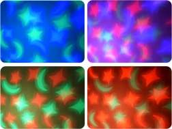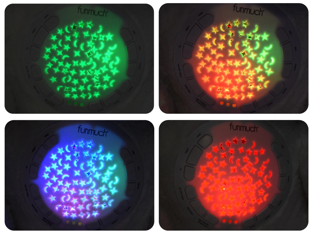 El proyector integrado dibuja estrellas de colores y la luna por toda la habitación en tonos rojo, rosa, verde, naranja y azul, ideal para los rituales nocturnos.