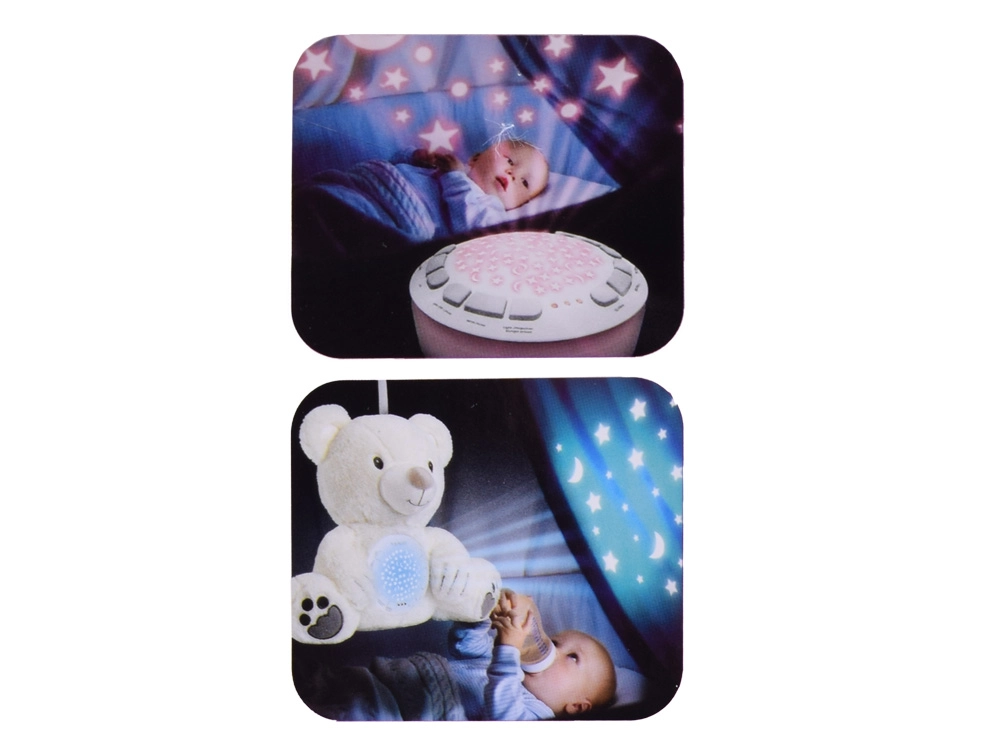 La proyección en colores rojo, rosa, verde, naranja y azul se funde de forma gradual para crear un espectáculo mágico. La práctica alimentación por baterías permite llevarse el osito a cualquier parte: a la cuna, al cochecito o de viaje.