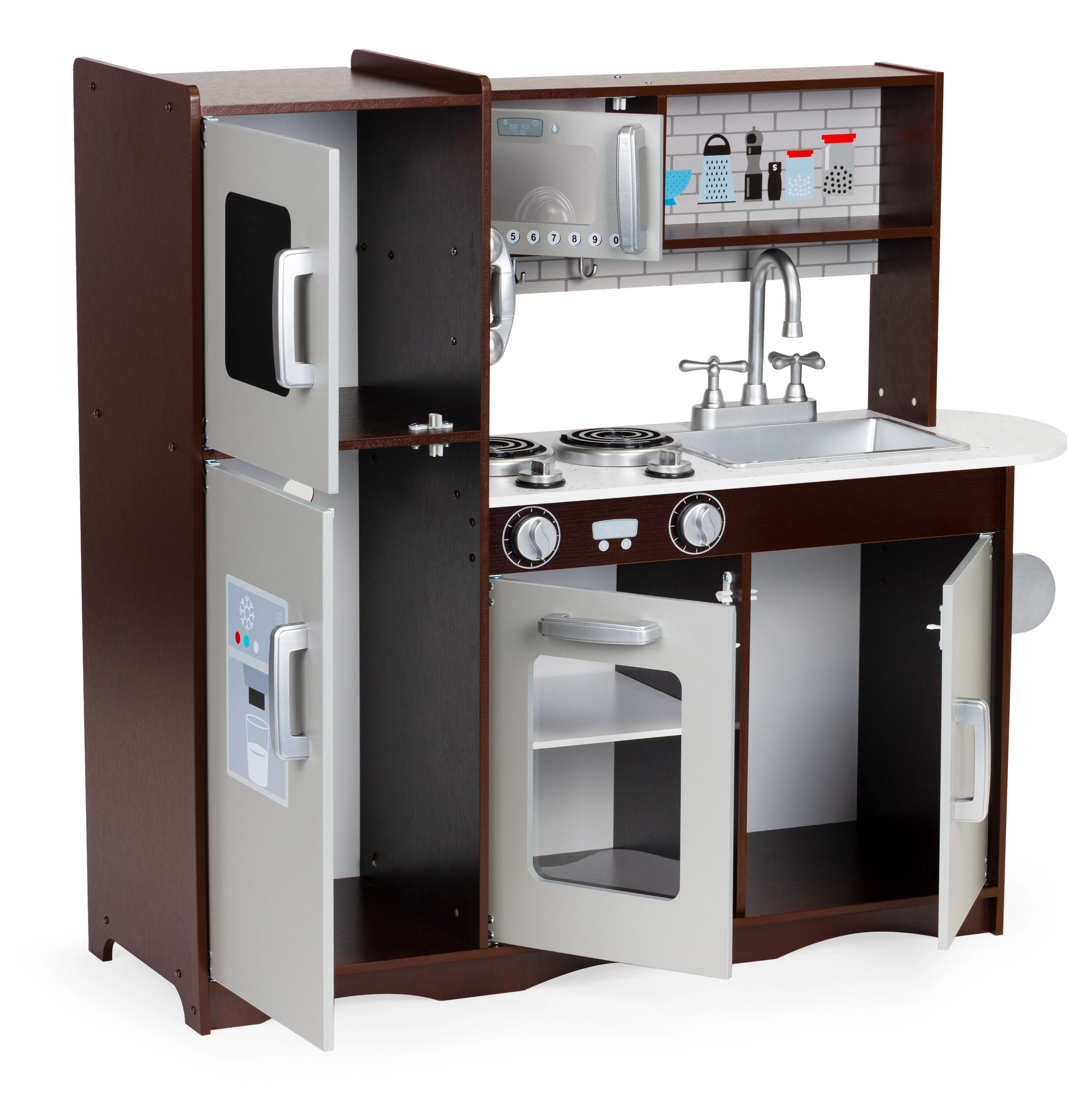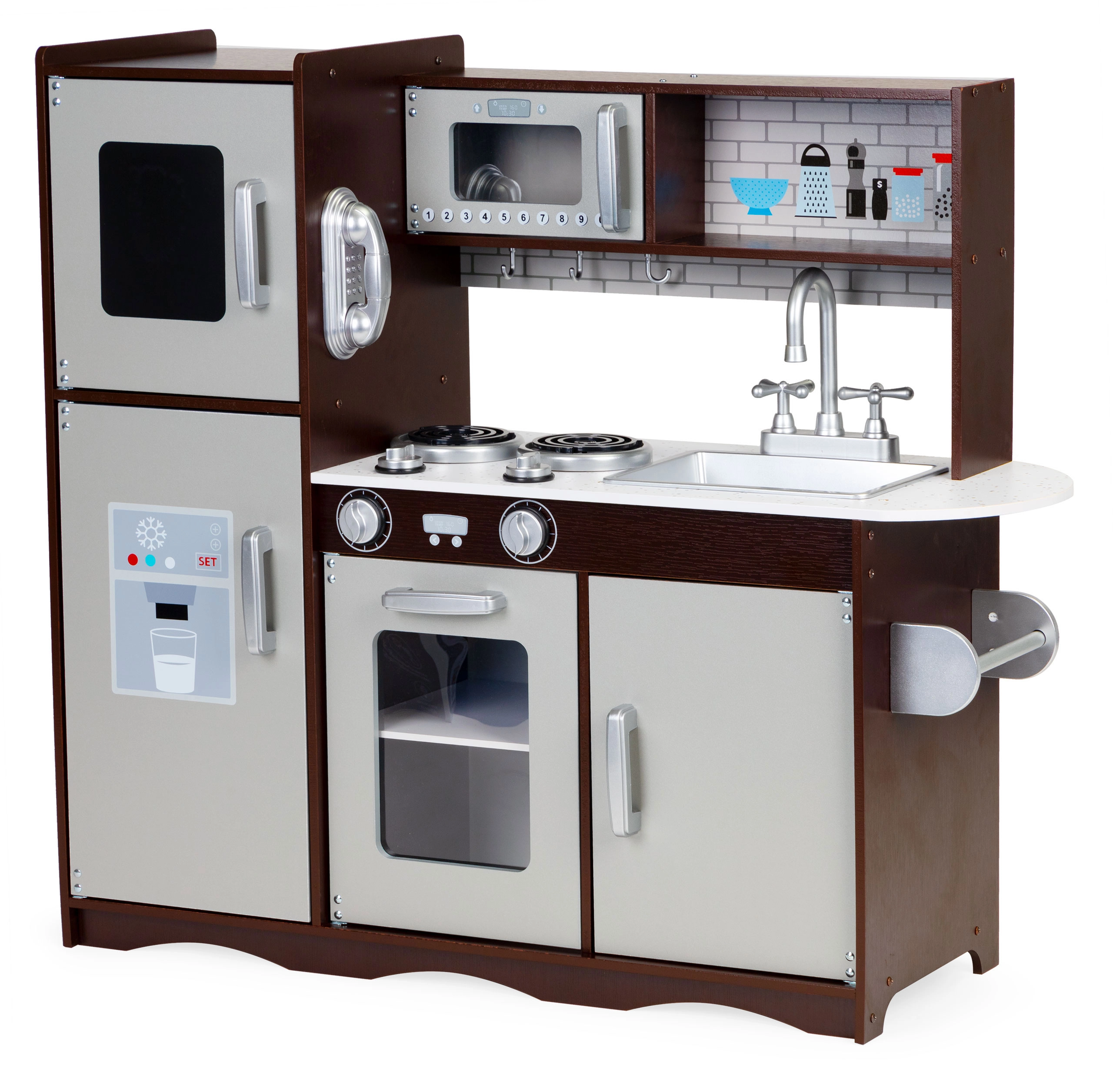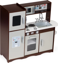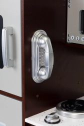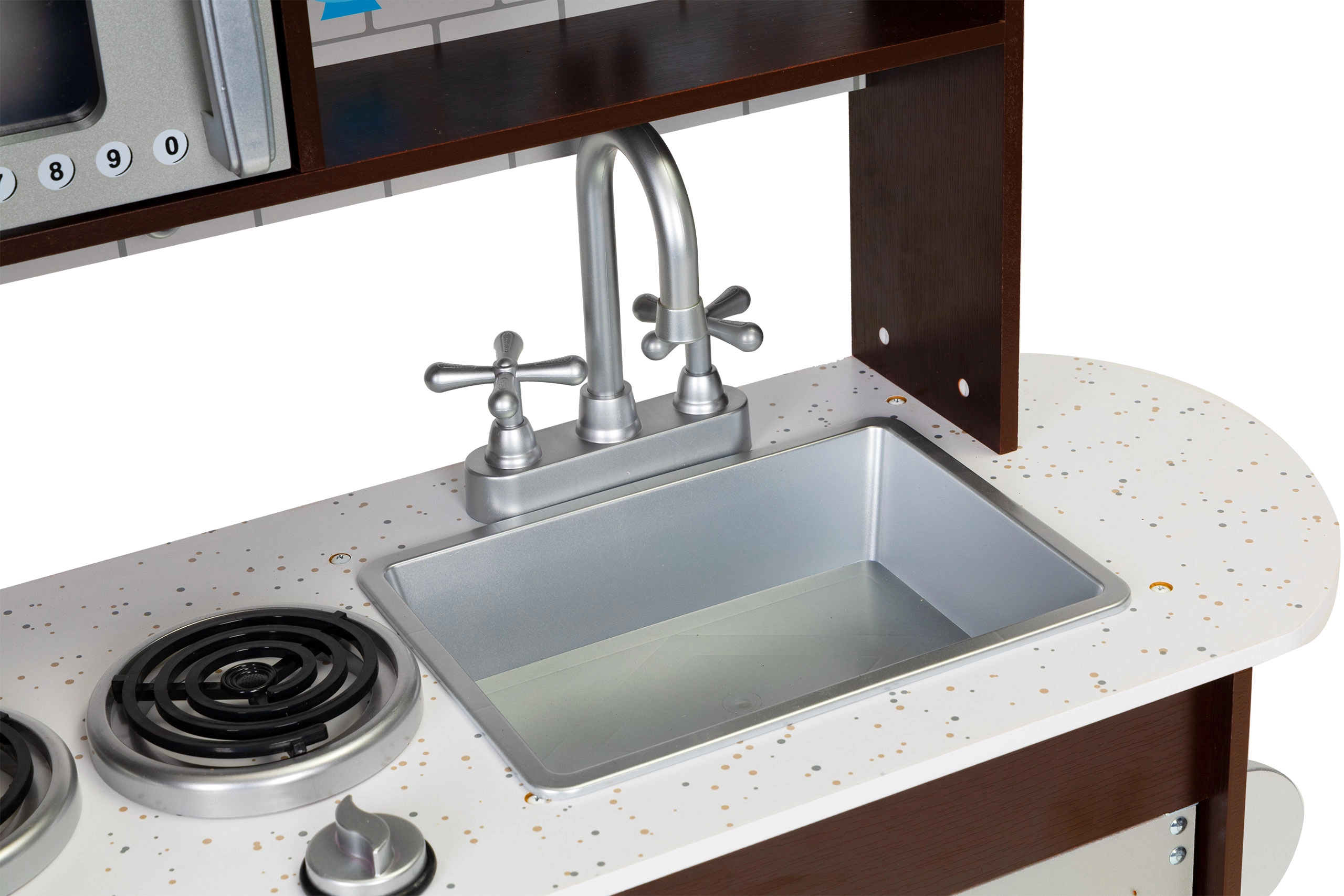 Como en una cocina de verdad, los niños tienen la posibilidad de hornear, cocinar y calentar la comida en el microondas y luego lavar todos los utensilios en el amplio fregadero y guardarlos en su lugar.