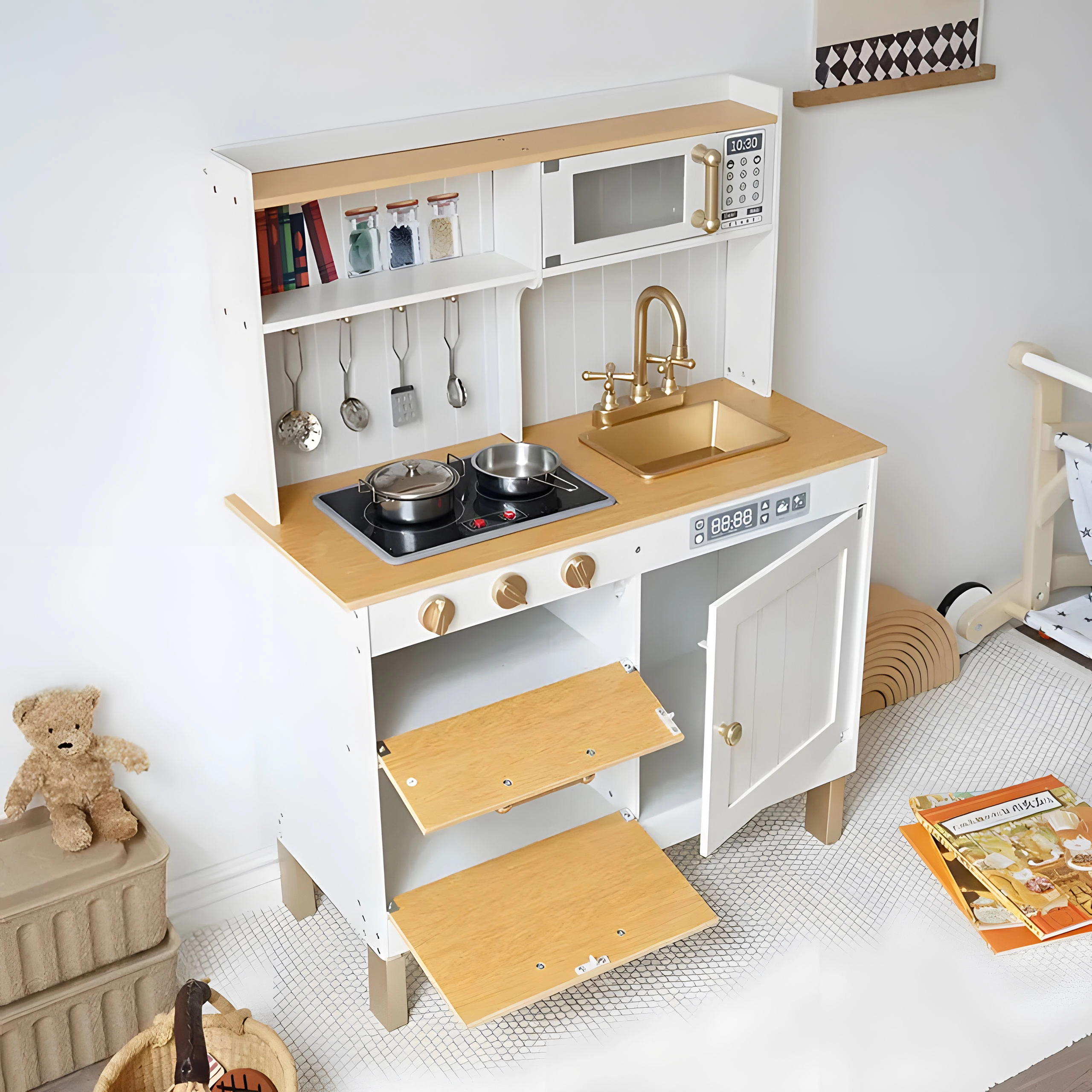 La cocina cuenta con quemadores con iluminación LED y efectos de sonido que recrean a la perfección la cocción real. El espacio de juego se amplía con puertas de armario abatibles y perillas giratorias que emiten un sonido auténtico