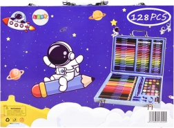 Completo set artístico para niños que incluye 128 piezas en un elegante maletín azul con motivo de astronauta. Ofrece todo para dibujar y pintar: lápices de colores, ceras, témperas, pincel, regla, goma y sacapuntas. Ideal para desarrollar la creatividad y la motricidad fina, un regalo perfecto para pequeños artistas.