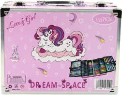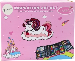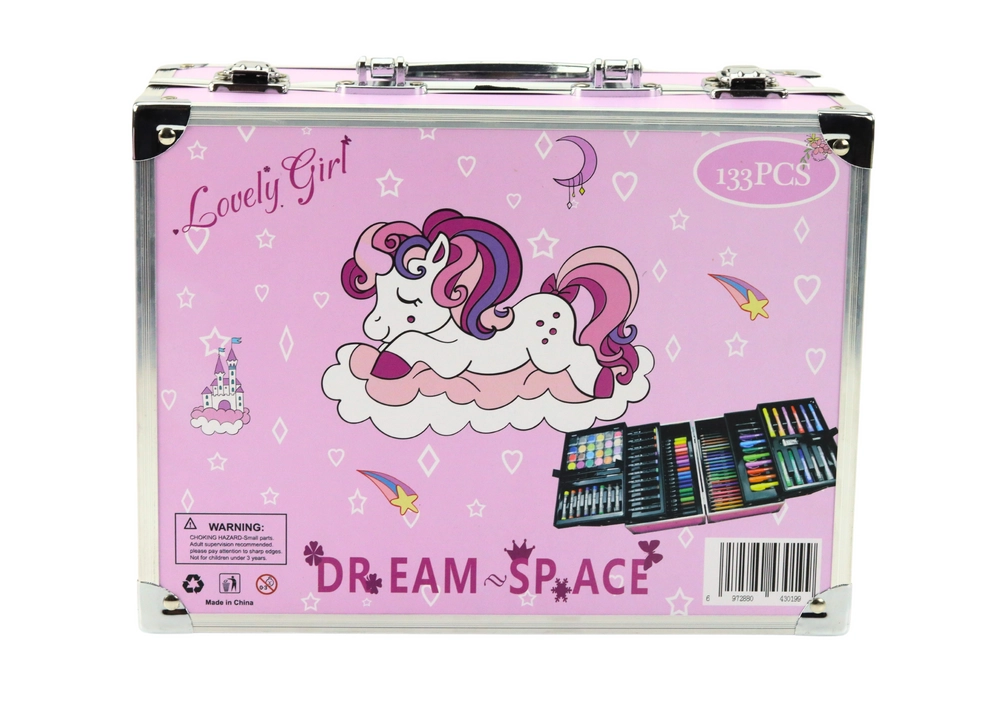 Completo set de arte con motivo de unicornio en un práctico maletín desplegable que incluye hasta 133 piezas para pintar y dibujar. Encontrarás rotuladores acrílicos, marcadores de doble punta, pasteles, lápices de grafito y de colores, acuarelas, pinceles, goma de borrar, sacapuntas e imágenes para colorear. Ideal para niños a partir de 3 años, fomenta la creatividad y la motricidad fina y se transporta fácilmente gracias a sus dimensiones compactas y asa.