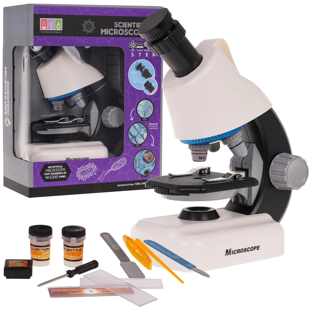 Vive el fascinante mundo de la microscopía con nuestro microscopio blanco, ideal tanto para fines educativos como recreativos. Este microscopio no solo ofrece un impresionante aumento de hasta 1200x, sino que también incluye diversos accesorios que facilitan la observación de muestras.