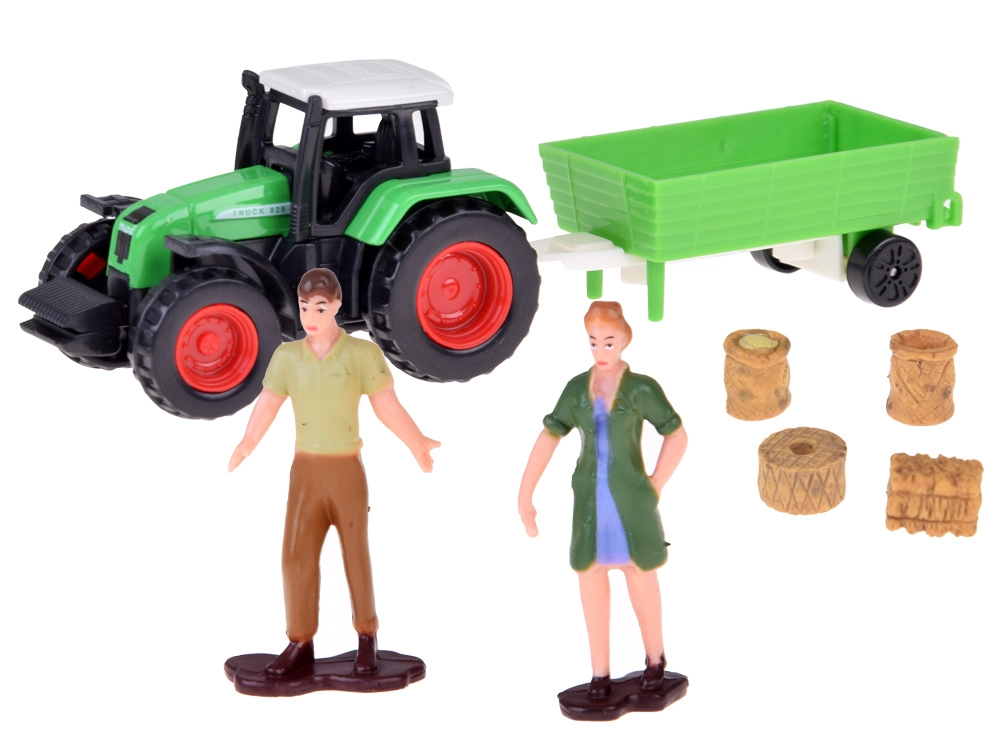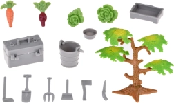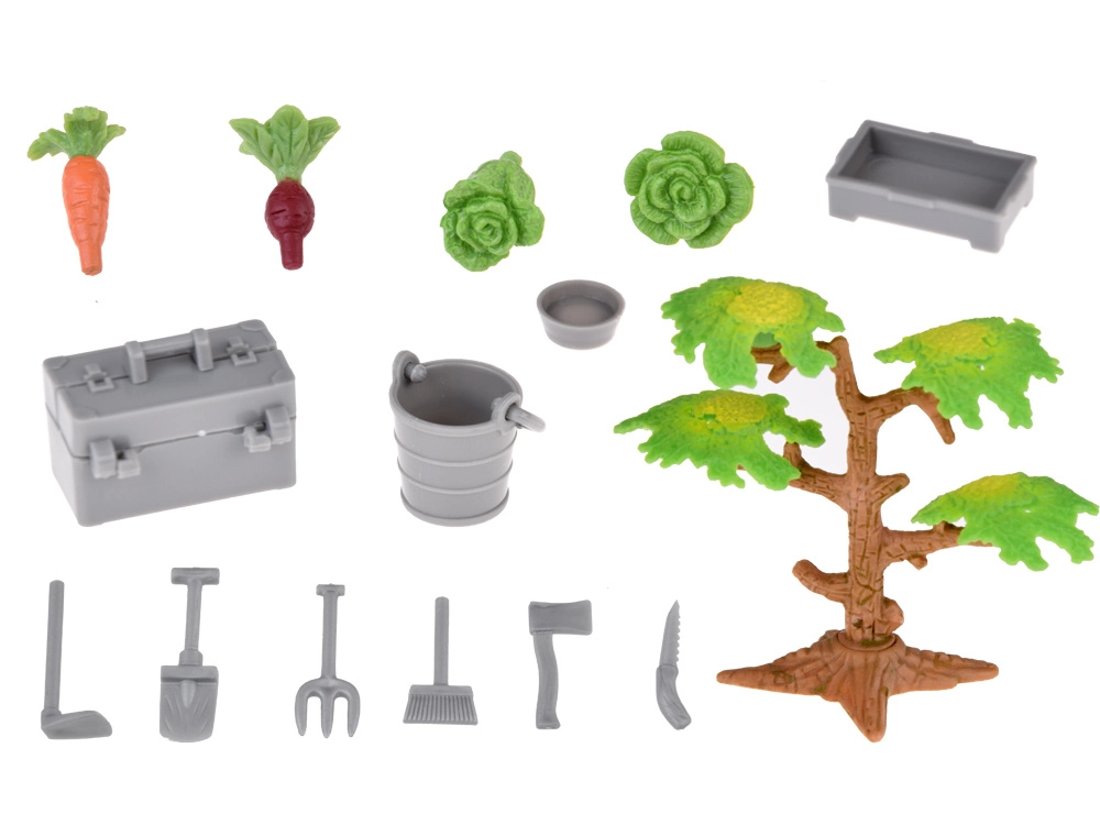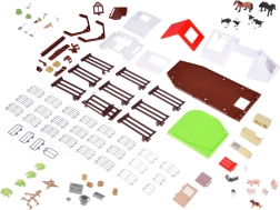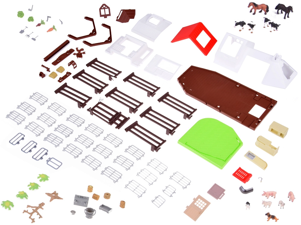 El set incluye figuras de animales de plástico como perros, caballos, cerditos, ovejas y vacas, fabricadas con gran atención al detalle. No faltan los personajes del granjero y la ama de casa, que enriquecen el juego con las tareas diarias de la granja. El set también cuenta con un tractor con remolque, herramientas de jardín y pegatinas decorativas para personalizar la granja.