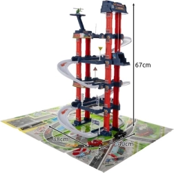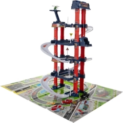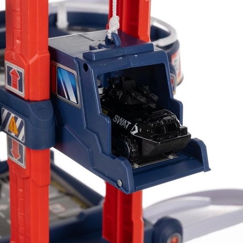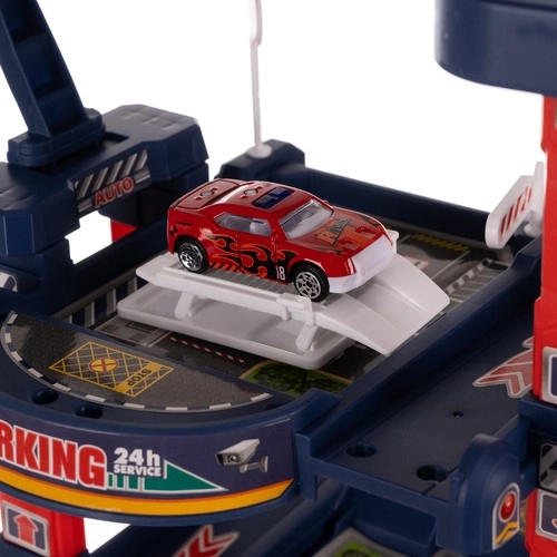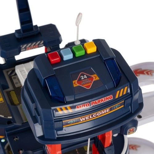 El ascensor interactivo puede fijarse a la izquierda o a la derecha, se controla con botones de colores (subir/bajar) y va acompañado de luces intermitentes y efectos de sonido (sirenas, claxon, maquinaria), que potencian la imaginación infantil. Se incluye una gran alfombrilla de juego con mapa de la ciudad sobre la que montar los garajes y colocar las señales, además de 2 cochecitos y un helicóptero.