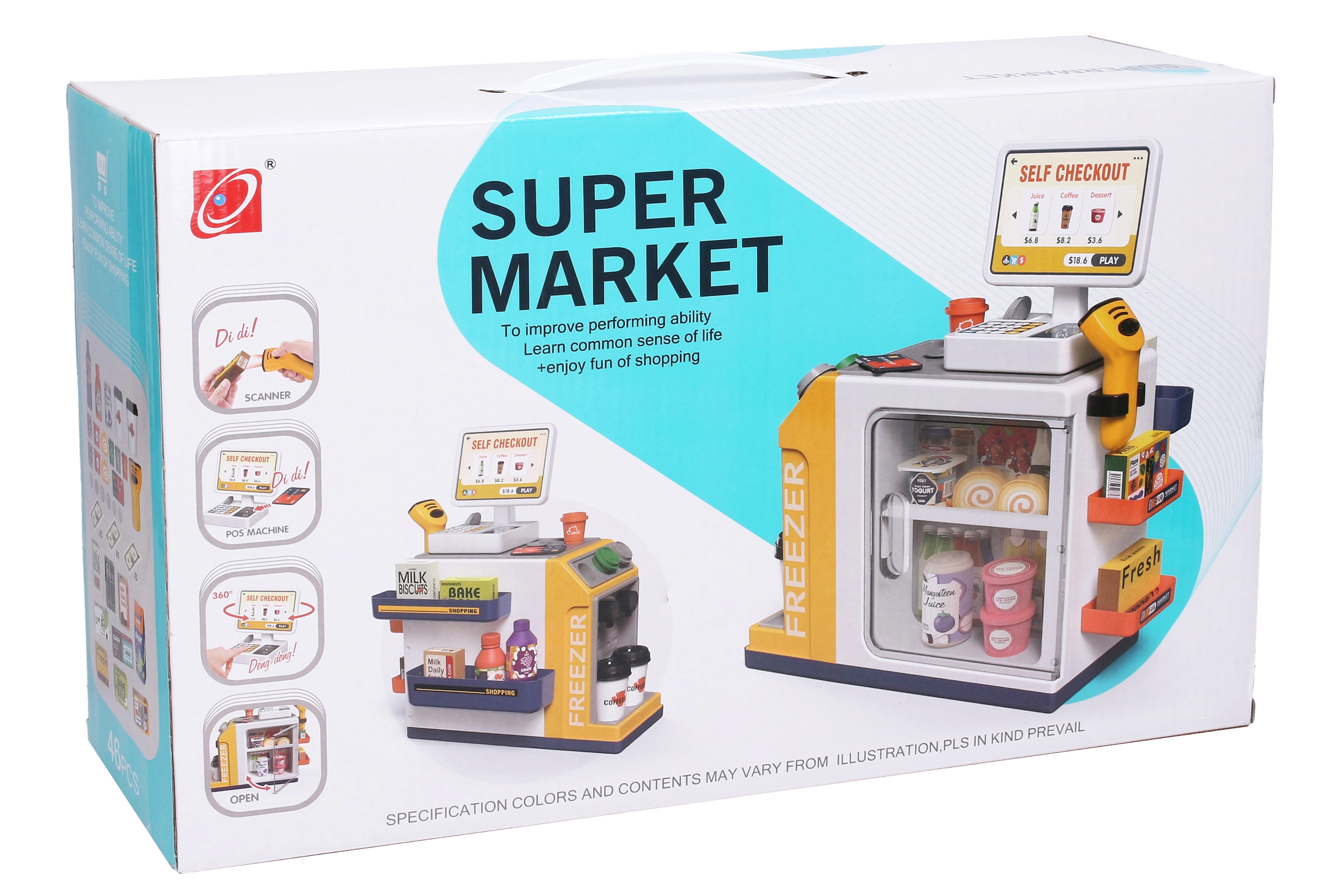 Este set de supermercado es el juguete perfecto para todos los pequeños entusiastas de las compras. El set incluye todo lo que esperarías en un supermercado real: mesa con caja registradora, lector manual, tarjeta de pago, billetes de papel y monedas. Para los juegos de tienda, también encontrarás en el paquete imitaciones de cafés, zumos, yogures, leche, sushi y dulces.