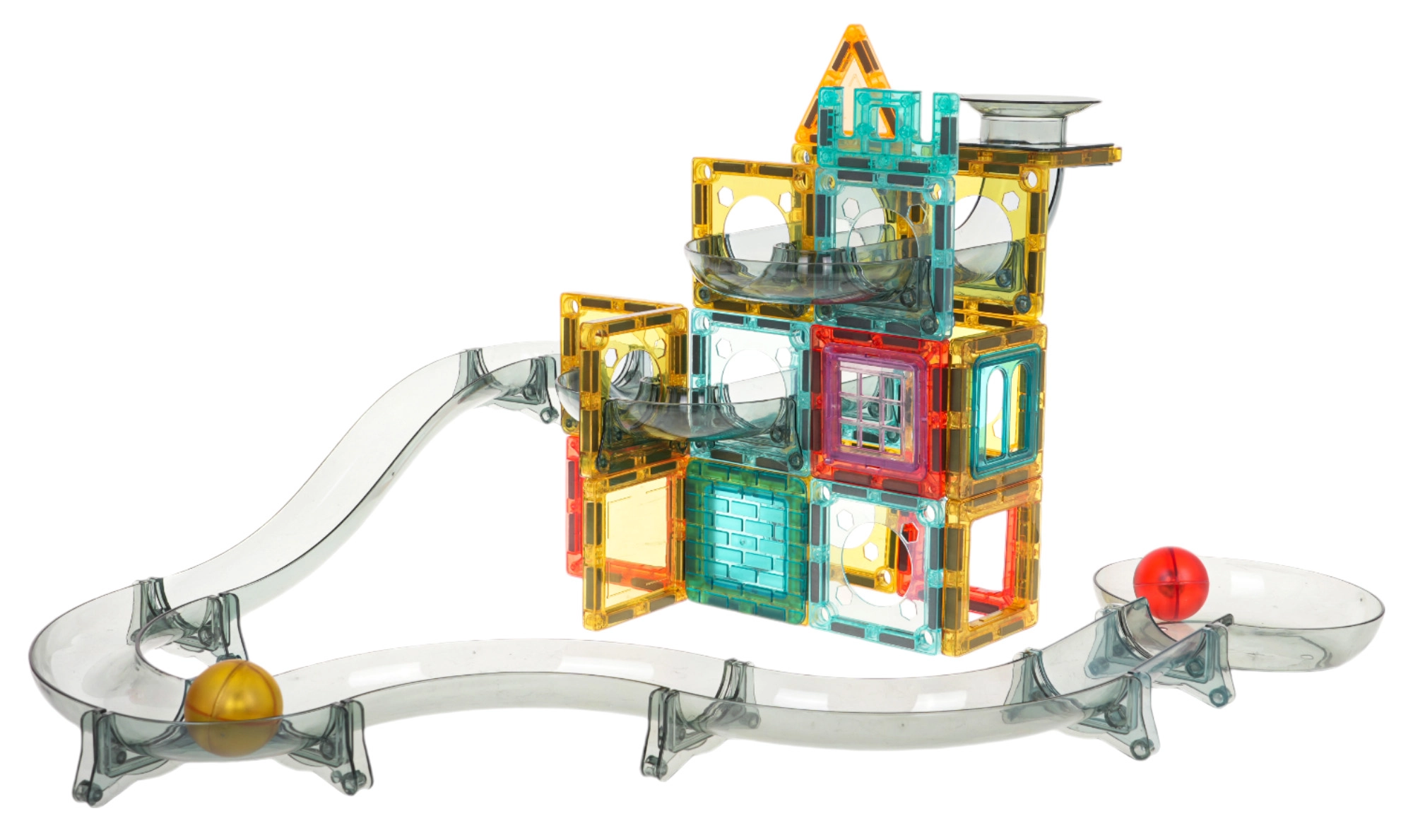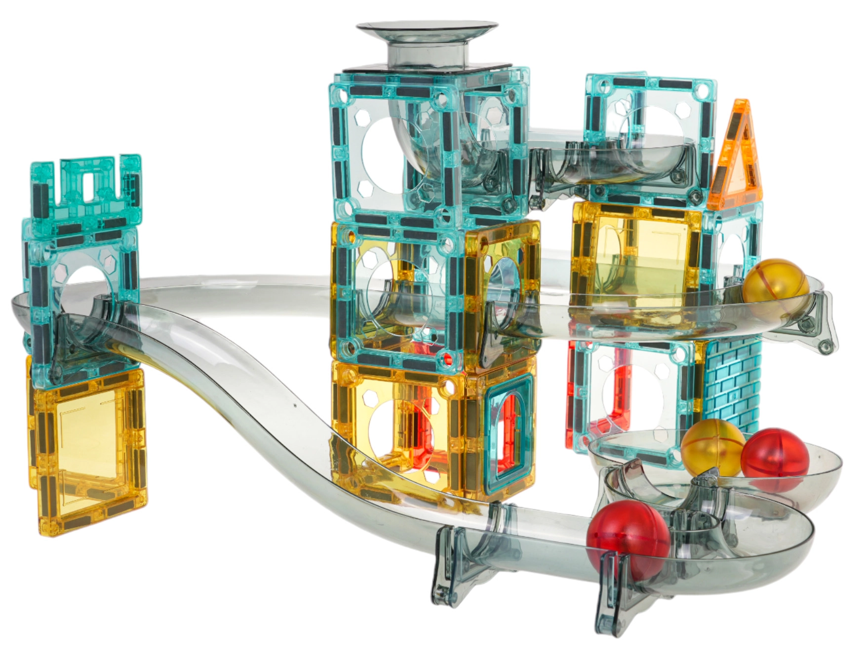 Los túneles y curvas translúcidos permiten a los niños ver todo el recorrido de las canicas y comprender mejor los principios del movimiento.