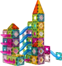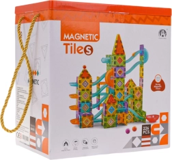 Este amplio juego combina baldosas magnéticas y elementos para pistas de canicas, para que los niños a partir de 3 años puedan construir torres, castillos y recorridos originales para canicas de colores. Las piezas están fabricadas en plástico liso de alta calidad y colores vivos; los bordes magnéticos se conectan fácil y firmemente, por lo que las construcciones se mantienen estables incluso en estructuras altas.