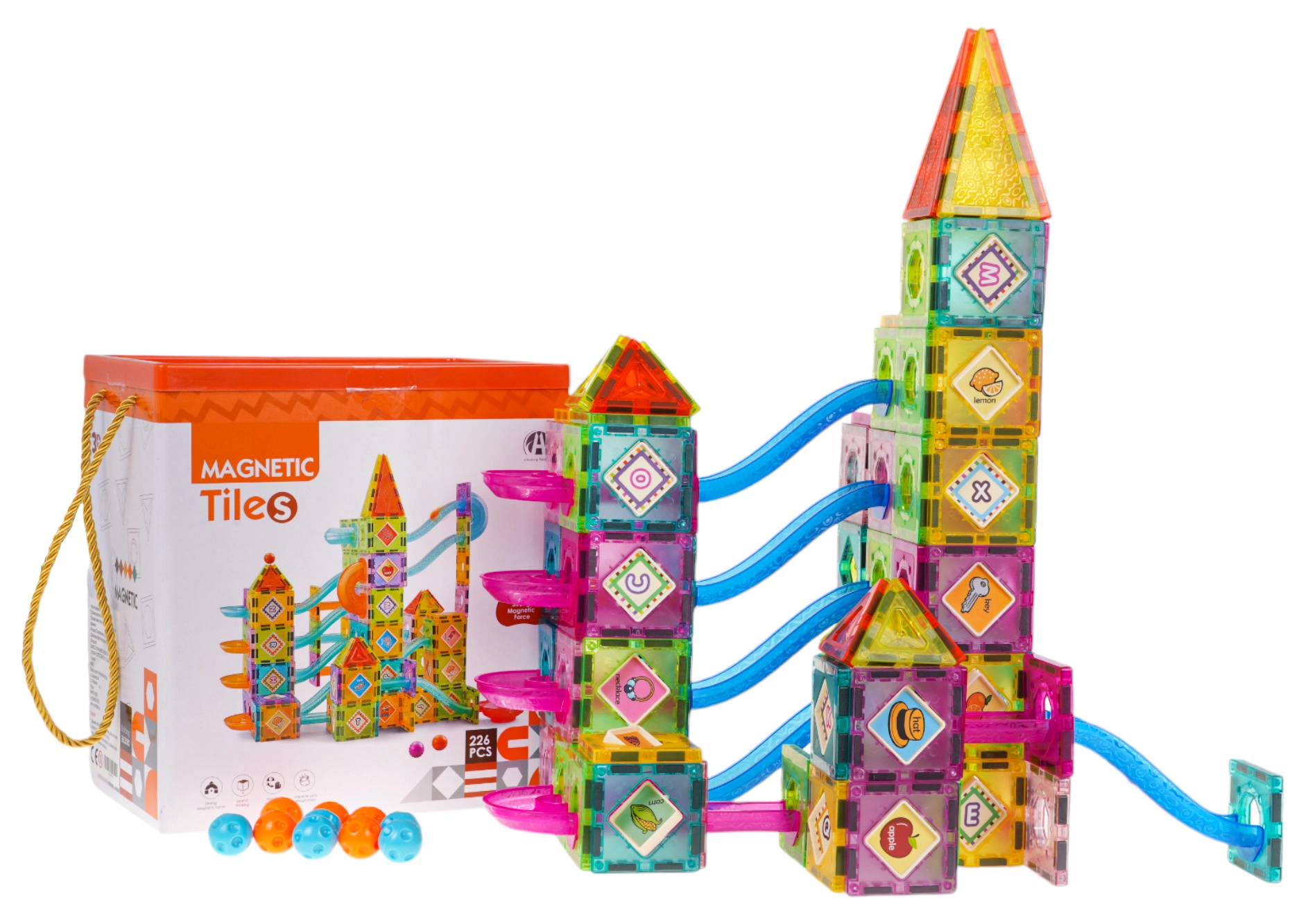 El paquete incluye todo lo necesario para empezar rápido: 226 piezas incluyendo 106 elementos magnéticos, 10 canicas, pegatinas decorativas, guía ilustrada y una caja resistente con asa para transportar. La tapa de la caja está equipada con un clasificador de formas que estimula el aprendizaje a través del juego.