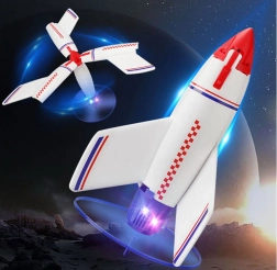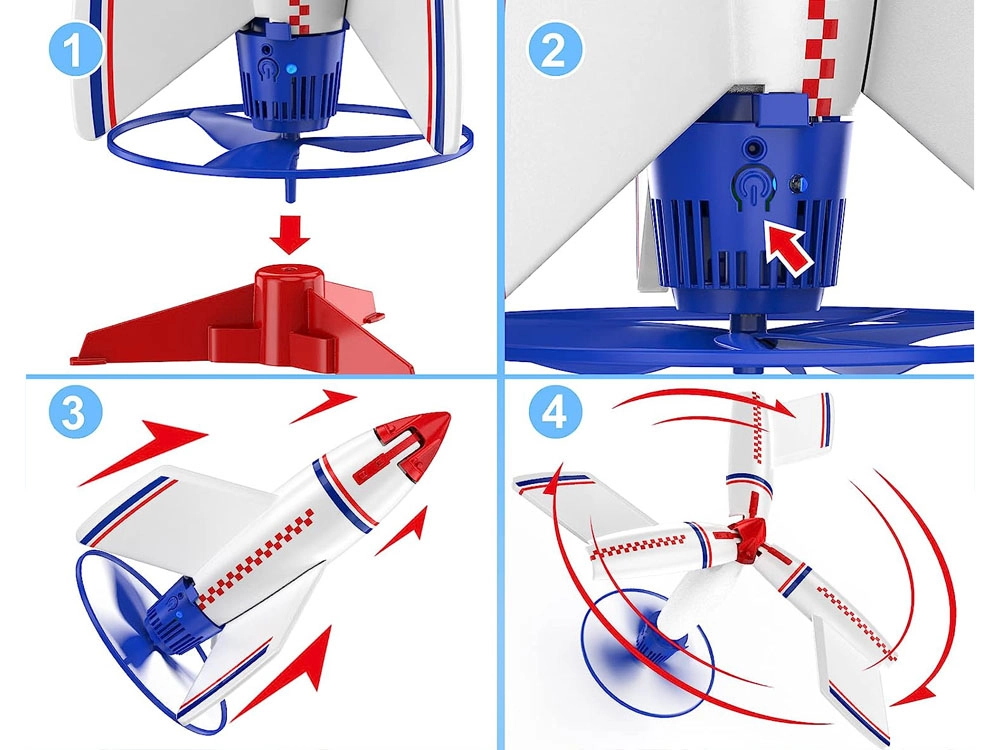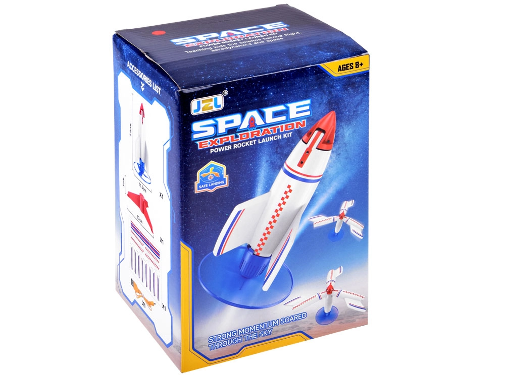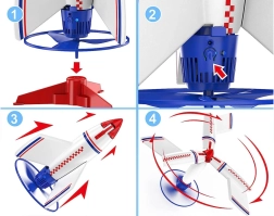 Este cohete ligero y resistente combina un armazón de plástico con espuma blanda para un uso más seguro. Durante el descenso, las alas se abren automáticamente y actúan como paracaídas, garantizando un aterrizaje estable y suave. El despegue es sencillo: basta con colocar el cohete en la plataforma de lanzamiento y activarlo con el botón o el control remoto.