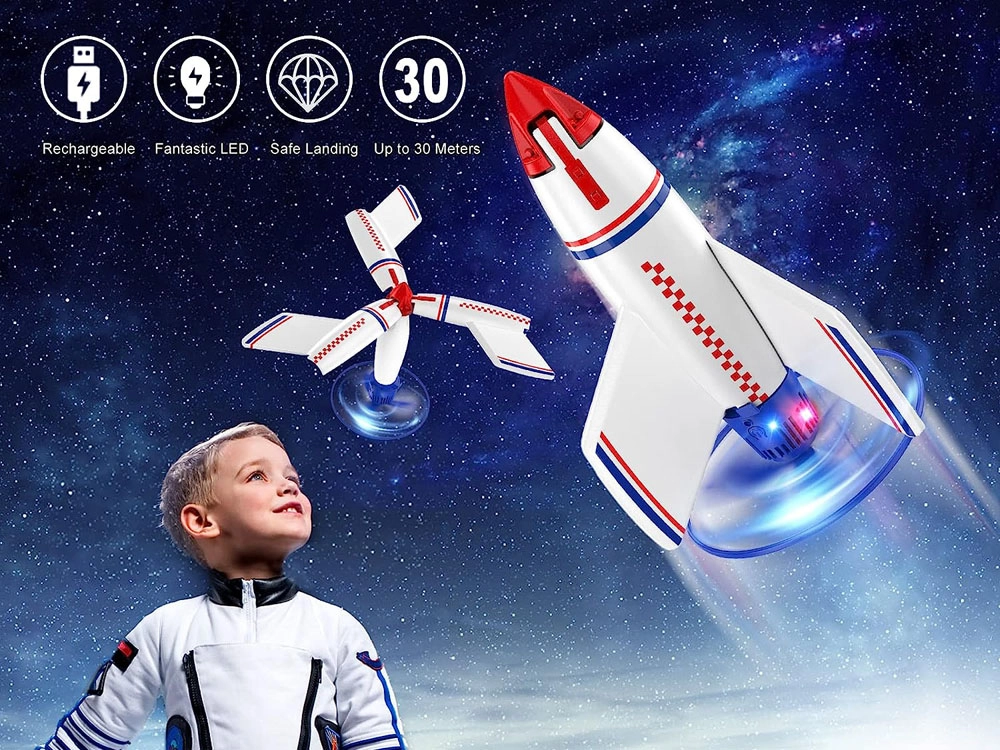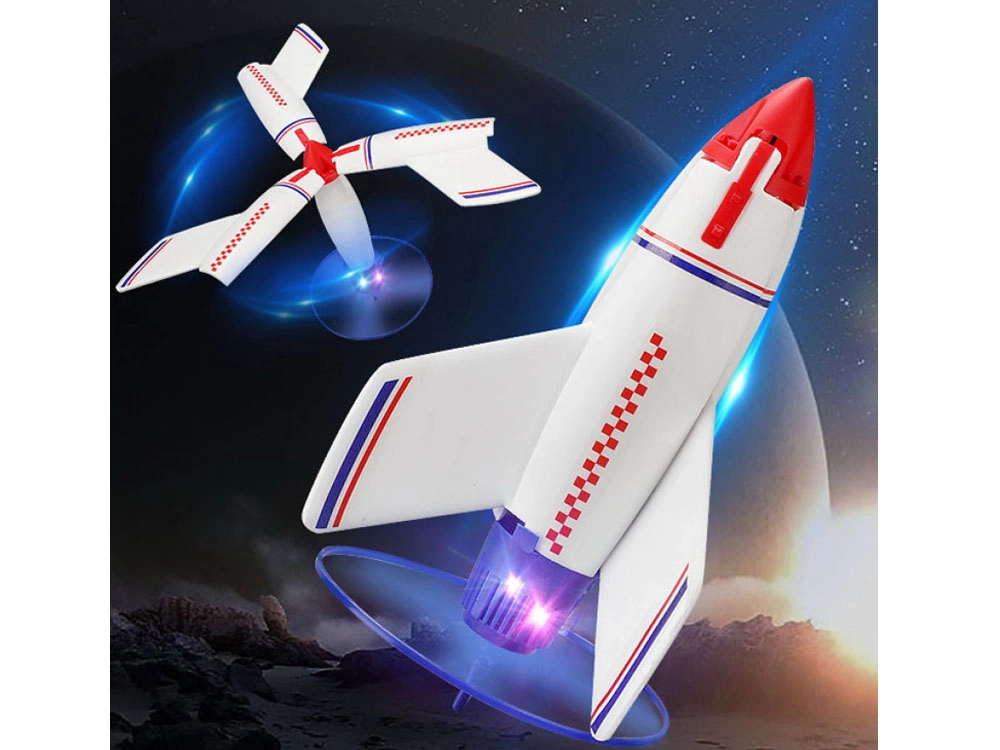 Descubre la diversión con este cohete volador, que se eleva hasta una altura de alrededor de 30 metros y luego aterriza automáticamente gracias a sus alas desplegables. Incluye plataforma de lanzamiento, control remoto, batería integrada y cable USB para la carga: ideal para las aventuras al aire libre de los pequeños astronautas.