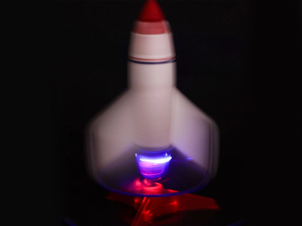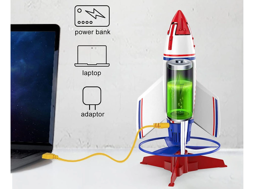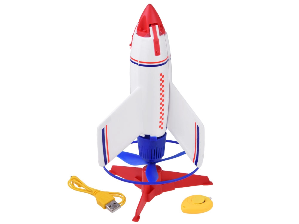 - Fácil manejo: botón en el cohete o mediante el control remoto ON/OFF