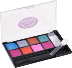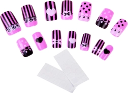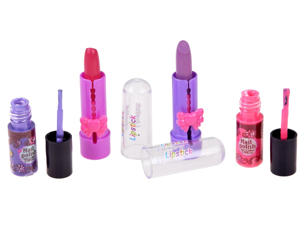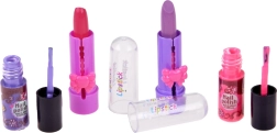 Brillos, barras de labios, lacas, paleta de sombras con aplicador y tips autoadhesivos, todo coordinado en divertidos tonos rosa y lila.