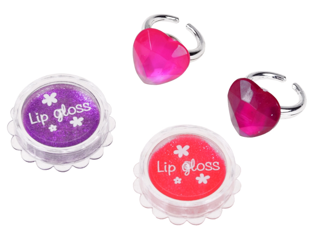 El set incluye todo para una transformación completa: sombras en crema con aplicador, brillos y barras de labios con purpurina, lacas de uñas, tips autoadhesivos con diseños listos y adorables anillos en forma de corazón. Jugar con la cosmética desarrolla la motricidad fina, el sentido del color y fomenta la autoexpresión.