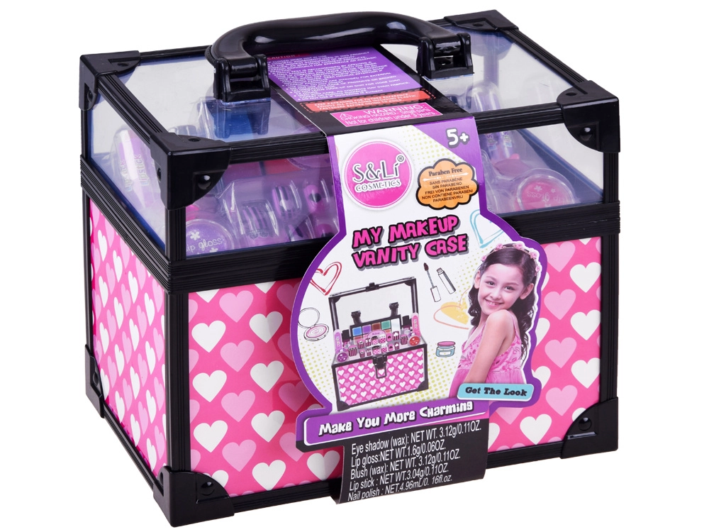 Un adorable maletín de cosmética infantil lleno de juguetes de maquillaje seguros que fomentan el juego creativo, la imitación de los adultos y el desarrollo de la imaginación. En el práctico maletín con asa encontrarás brillos labiales, barras de labios, laca de uñas, una paleta de sombras de ojos, tips autoadhesivos y anillos, todo en delicados tonos rosa y lila.