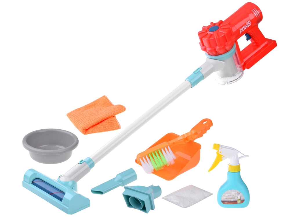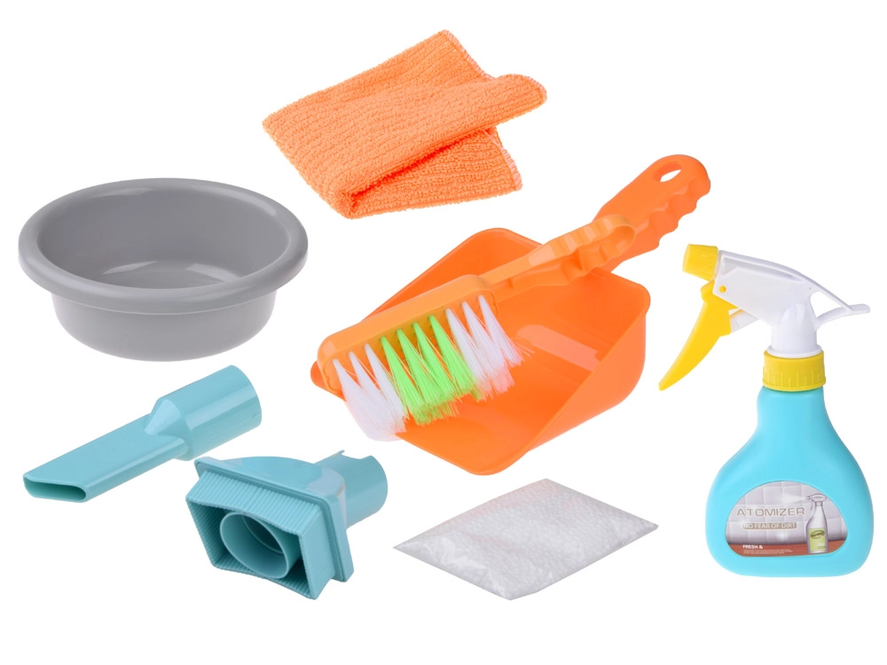 El paquete también incluye puntas intercambiables, escobilla con recogedor, pulverizador, paño y otros pequeños accesorios, gracias a los cuales los pequeños ayudantes desarrollan la motricidad fina, la imaginación y aprenden a cuidar el orden.