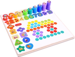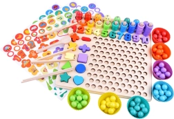 Este completo set para la habitación infantil ofrece una variada gama de juegos y retos que promueven el aprendizaje a través del juego. Los niños practican el reconocimiento de formas y colores, aprenden números y cantidades, y con la caña magnética disfrutan de la popular pesca. También incluye la composición de patrones con cuentas y bolitas siguiendo modelos, ideal para la concentración y la paciencia.